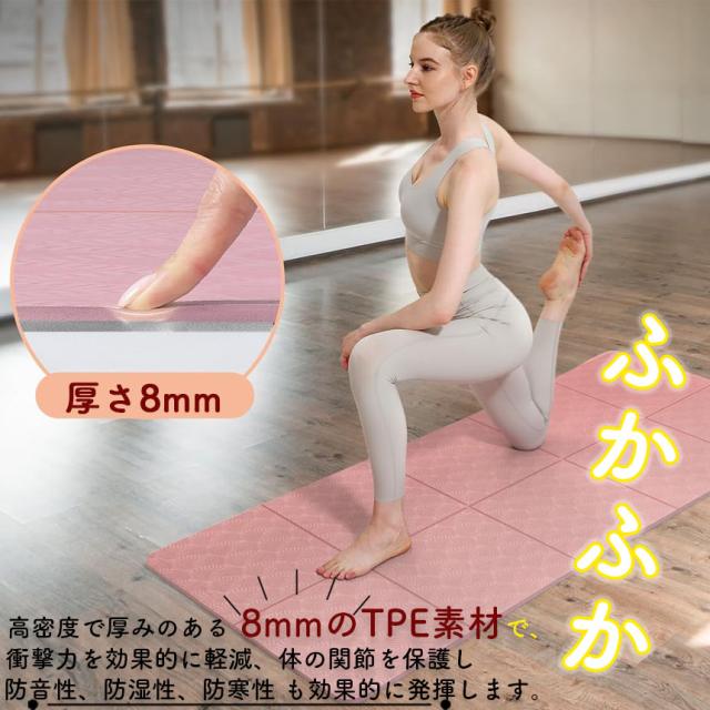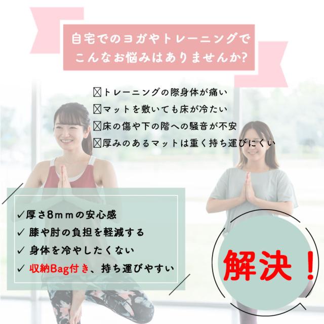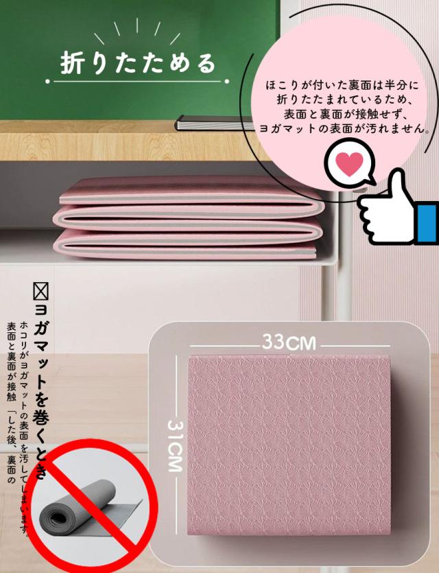 - 自転車でヨガとピラティスに通っているので、ロールタイプのマットが煩わしかったので購入しました。 厚みが8ミリあり丈夫そうです。リバーシブルになっていて裏表がわかりやすく、滑り止めもしっかりしています。付属の袋も不織布ではなかったので良かったです。 実際に使ってみた所、今まで使っていたロールタイプが10ミリで柔らか目だったので、厚みはあるが、固めなので木のポーズ等の時はとても使いやすい!滑り止めがしっかりしてて、ずれないし、折り目の線が何気に便利でした。ピラティスの時は少し尾骶骨痛かったけど、タオルひけば問題なしです。とても気に入りました!