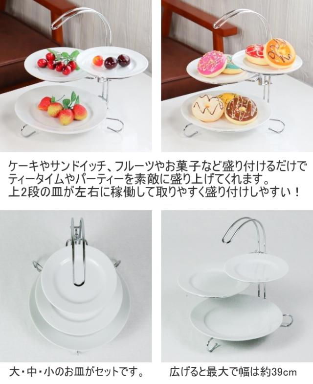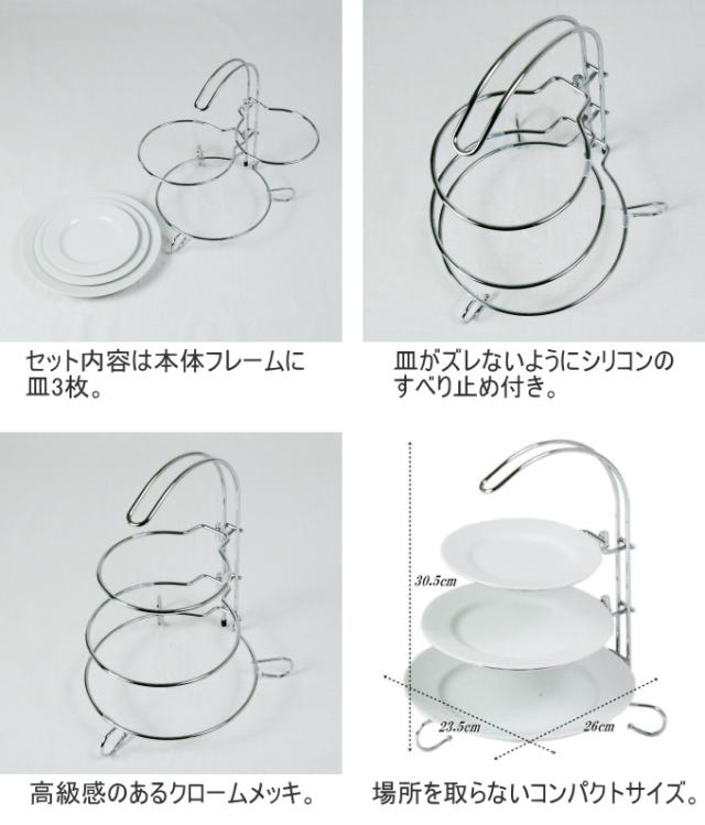 ケーキやサンドイッチ、フルーツやお菓子など、ティータイムやパーティーを素敵に盛り上げてくれます。 大中小3枚のうち上中のお皿は回転して華やかさを演出してくれたり、背の高い物を置いたりもでき、のせたりとったりがラクチン。 本体はクロームメッキで高級感があります。 セット内容は本体フレームに皿3枚。 皿受けのステーは皿のズレ防止にシリコンのストッパーがついています。 ちょっとしたホームパーティーやバースディパーティーなどに、楽しい時間を演出してくれます。 |