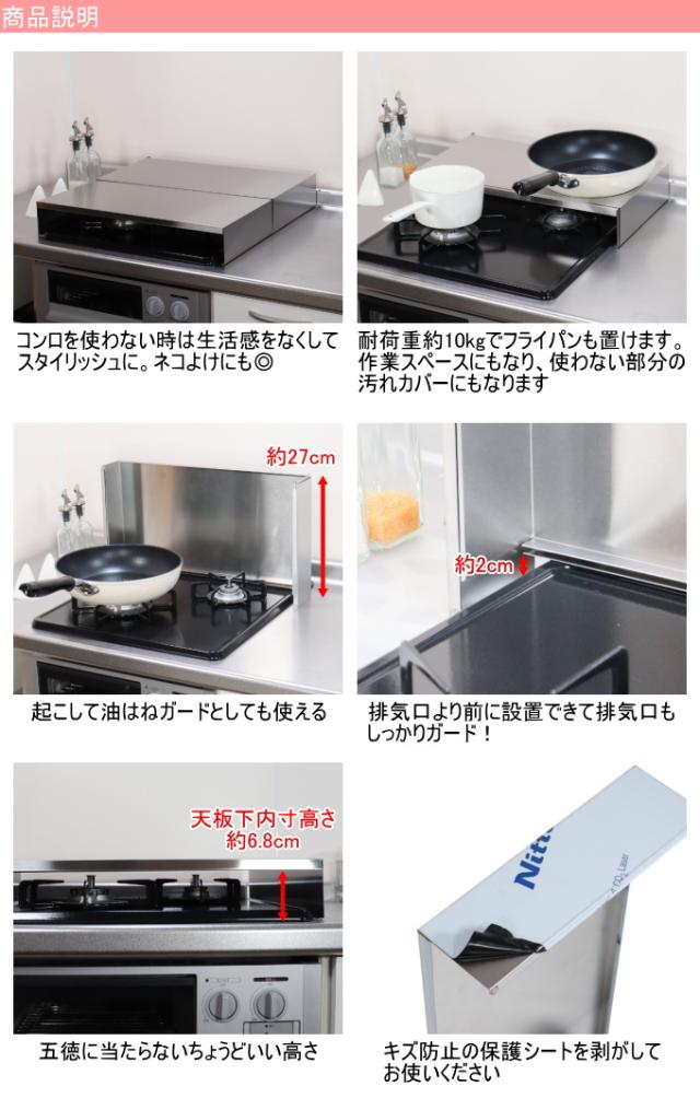 グリル使用の際は、グリルを避けてご使用ください。 一部のコンロで排気口が特殊な形状をしているタイプもありますが、排気口カバーとして使用するときに完全に排気口がカバーできない場合もあります。 ※表面隅の線状の物について 製造工程でどうしても付着するもので、ブルーシートの粘着剤の跡で傷ではありません。 スポンジなどで優しく拭き取っていただくと取れます。 |