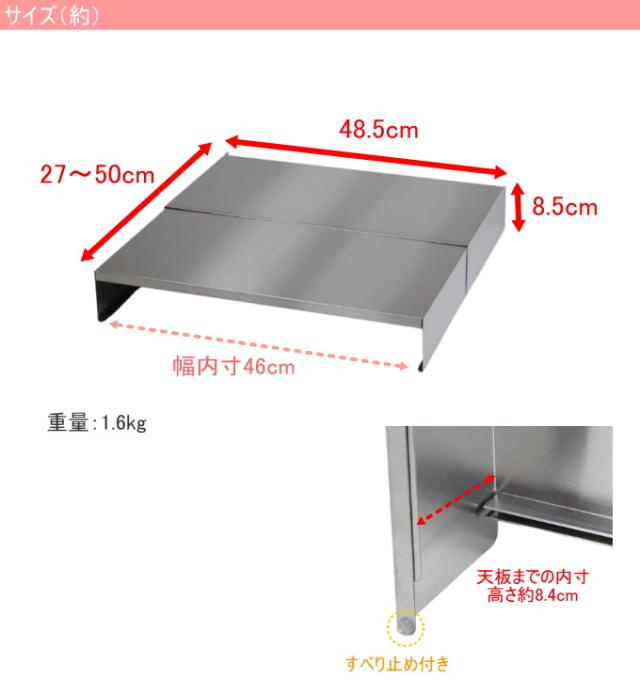 前後伸縮式で用途に合わせてハーフ〜フルカバーできるコンロカバー。 全部引き出して、コンロ全体をフルカバーして目隠しや猫除けとして。 半分の状態でフライパン置きや、作業台の延長で調味料や調理小物をちょい置き。 排気口の手前に立てかけて排気口カバーや油ハネガードとして。 1台で6役の賢いアイテム! 材質はステンレス製でサビに強く長持ちします。 アパートなど賃貸でよくある2口タイプコンロにぴったりです。 使う前に保護用のブルーシートをはがしてご使用ください。 (限界シールのみ貼ってください) |