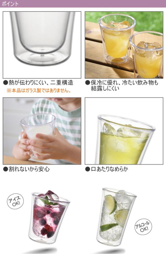 われないから安心。みんなのダブルウォールグラス。 哺乳瓶にも使われる安心の「トライタン」製。 ガラスのように透明なのにとっても丈夫!家族みんなで使えます。 フレアで軽やかなシルエット。 細身で持ちやすいスリムタイプです。 二重構造なので氷が溶けにくく、冷たさ、温かさをより長く保ちます。 結露しにくいのも特長です。 食器洗い乾燥機対応。 |