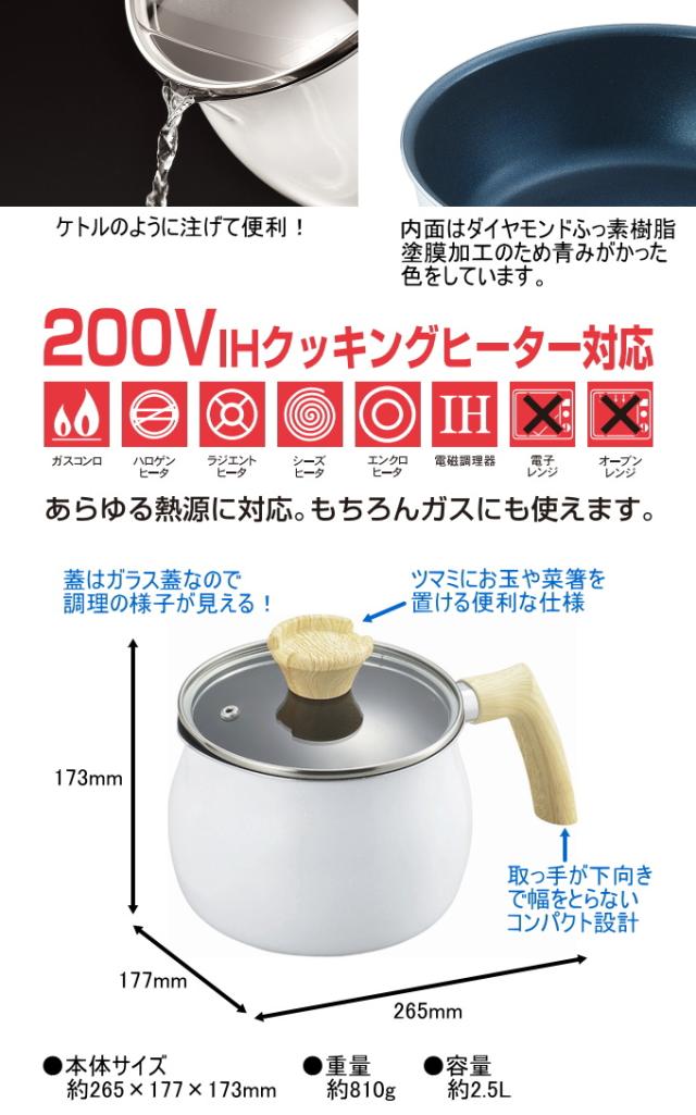 ホワイトカラーと木柄風の取っ手がキッチンに馴染みます。 軽量で毎日の料理の負担になりにくい。 蓋はガラス蓋なので調理の様子が見えて大変便利です! ツマミにお玉や菜箸を置ける便利な仕様! 焦げ付きにくいダイヤモンドコート加工。 注ぎ口付で、ケトルやミルクパンとしても活躍する片手タイプのマルチポット。 煮物やスープをコトコト煮込むのにも丁度いい。 深さがあるので見た目より容量があって、茹でもの調理にもオススメです。 ガス火・IH電磁調理器100V・200V対応。 |