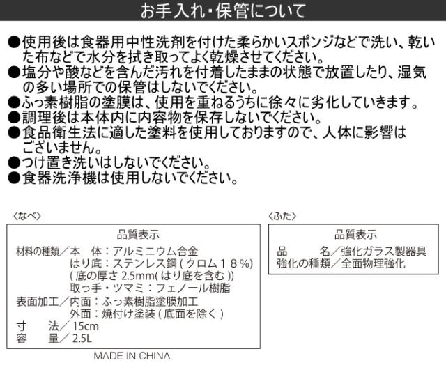 本体:アルミニウム合金(内面ダイヤモンドコートふっ素樹脂塗膜加工・外面焼付け塗装) はり底:ステンレス鋼(クロム18%) 底の厚さ:2.5mm(はり底を含む) フタ:強化ガラス 取っ手・ツマミ:フェノール樹脂 |