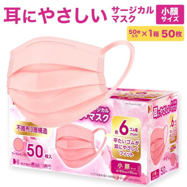 耳にやさしいサージカルマスク コーラルピンク 50枚(1箱) 小顔サイズ 長谷川綿行 日本マスク工業会会員 耳が痛くなりにくい 【日本産業規格 JIS T 9001 医療用マスク クラスII 適合】 ウイルス 飛沫 花粉 風邪 血色カラー