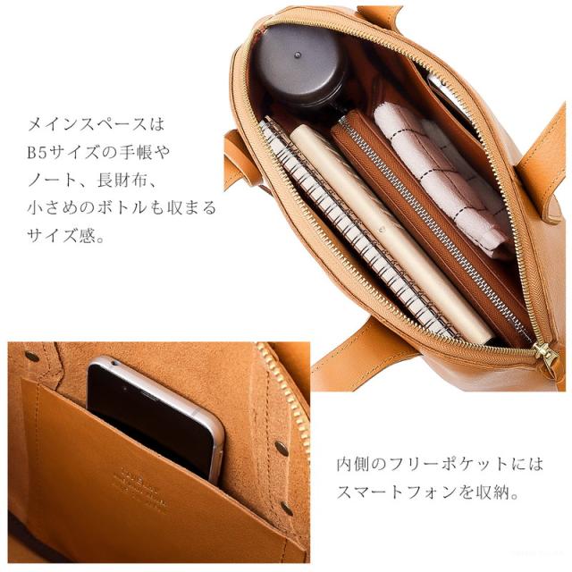 メインスペースは、B5サイズの手帳やノート、長財布、小さめのボトルも収まるサイズ感。