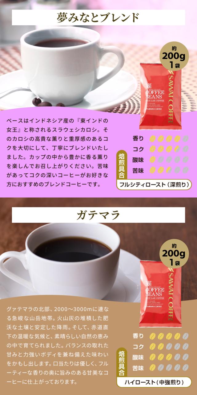 | 内容量 | ・キリマンジャロブレンド 200g×1袋 ・夢みなとブレンド 200g×1袋 ・ガテマラ 200g×1袋 ・ゴールデンブレンド 200g×1袋 ・オーロブレンド 200g×1袋 |