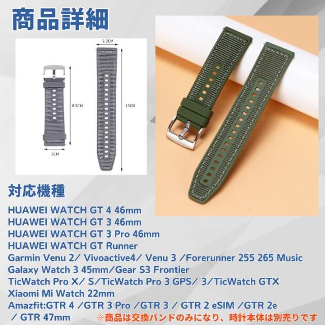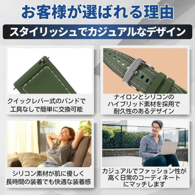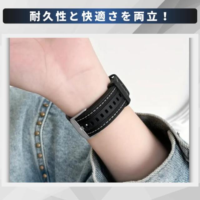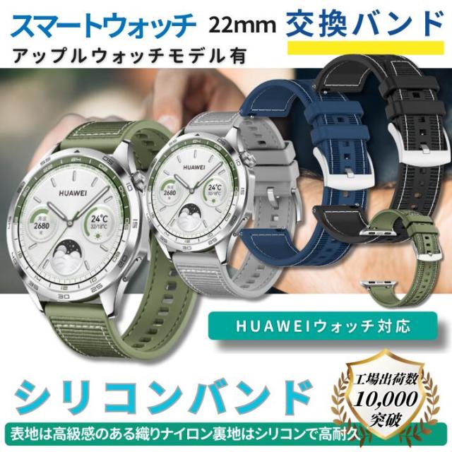 【22mm スマートウォッチバンド シリコン&ナイロン ハイブリッド】スポーツやアウトドアで快適に使える、22mm幅のスマートウォッチ対応バンドです。シリコンとナイロンのハイブリッド素材を使用し、通気性に優れたデザインで、長時間の使用でも蒸れにくく快適です。アップルウォッチ、ファーウェイ、ギャラクシー、アマズフィット、ゼンウォッチ、ガーミンなど、人気ブランドのスマートウォッチに対応しており、簡単に交換可能。