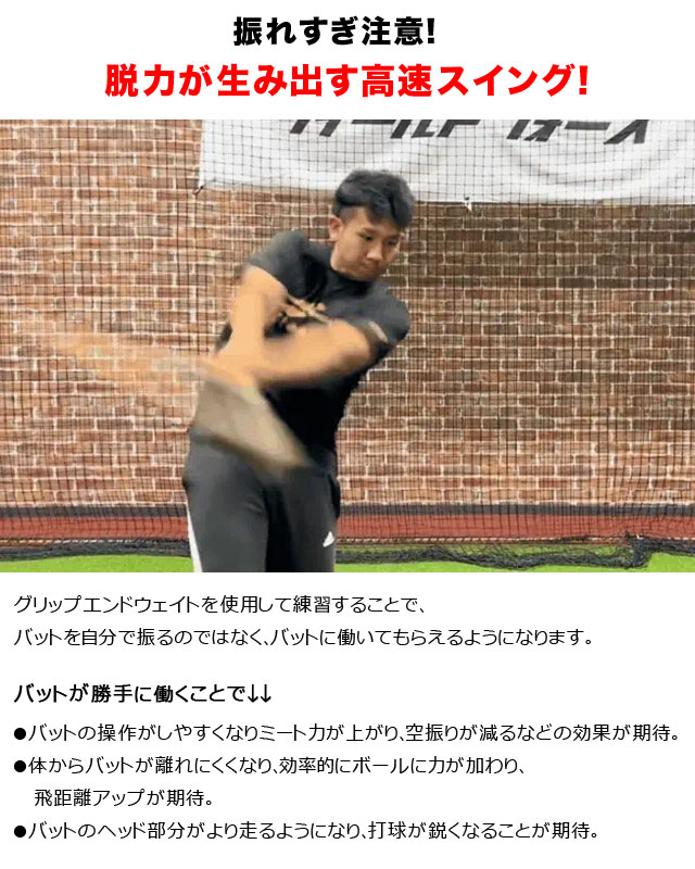 バットのグリップエンド部分にウェイトを設置し、手元側に重心を持ってくることで力を入れなくてもバットが勝手に振られるという感覚を容易に掴むことができます。