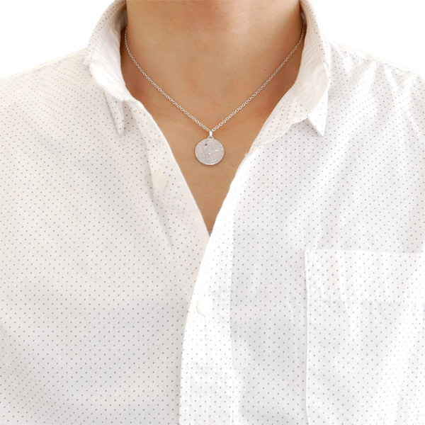 ペンダント自体はコインの丸みあるフォルムが柔らかい印象を与えつつ、どこかエッジが効いていて、つけるだけでスタイリングの主役として充分活躍できるアイテムに仕上がっています。