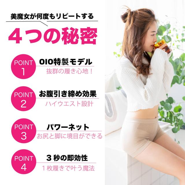 【OIOバック構造】OIOバック構造がお尻を両側から支え、中心に寄せてセクシーなお尻を作ります。お腹からお尻にかけて着圧構造となっており、お腹のハミ肉も お腹引き締め 効果でしっかりサポート!下半身全体をスッキリカバーして、気になるデコボコを軽減。着圧跡にもさよなら!