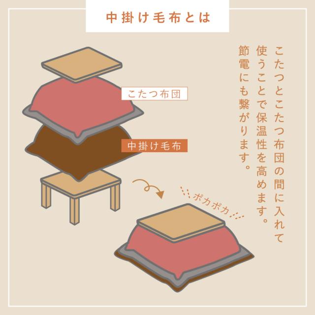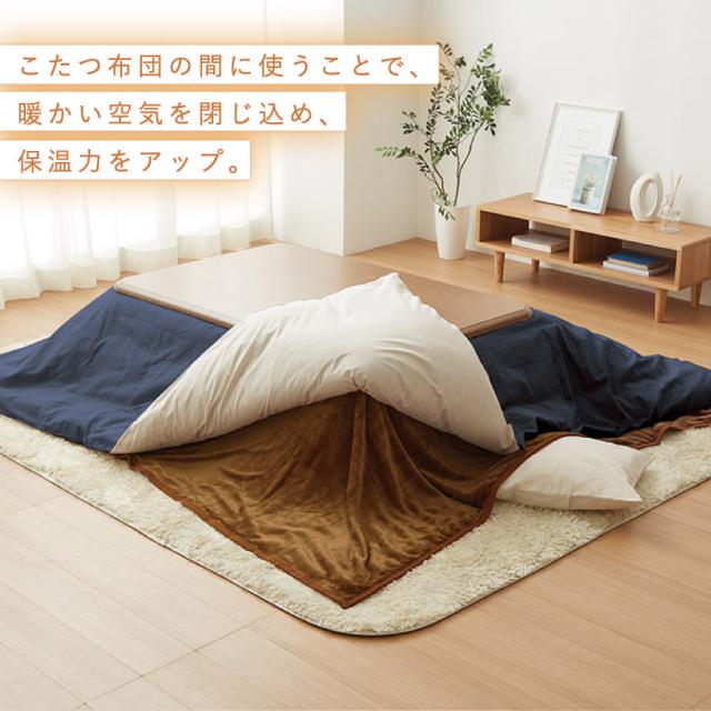 こたつとこたつ布団の間に入れる「中掛け毛布」として、暖かい空気を逃さず閉じ込めます。
