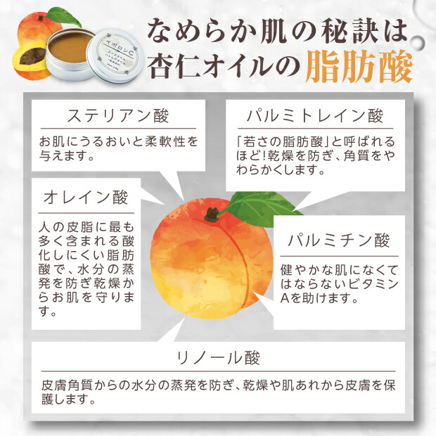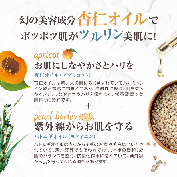 成分:アンズ核油、ミツロウ、野菜油、トリ(カプリル酸/カプリン酸)グリセリル、ハトムギ油、マンデル酸、アンズ種子エキス、ハトムギ種子エキス、バチルス発酵物、アスタキサンチン、カルボキシメチルヒアルロン酸Na、ヒアルロン酸Na、加水分解ヒアルロン酸、加水分解ヒアルロン酸アルキル(C12-13)グリセリル、ニンジン根エキス、ダイズ油、スクワラン、トコフェロール、グリセリン、水、ジイソステアリン酸ポリグリセリル-2、BG、PG、エタノール、銅クロロフィル