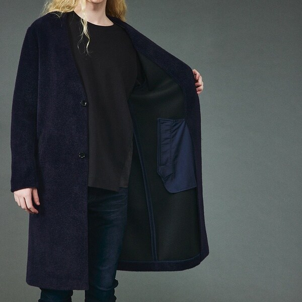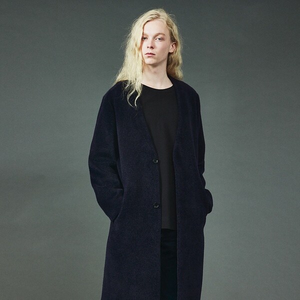 高級感あふれる光沢感とよりソフトな風合いを最大限に生かした素材感が魅力のノーカラーコート。マフラーやタートルネックなど首元のアレンジがしやすいのもポイント。ややゆったりとした優雅なシルエットで程よくトレンドを取り入れながらもベーシックにお使いいただけるアウターです。