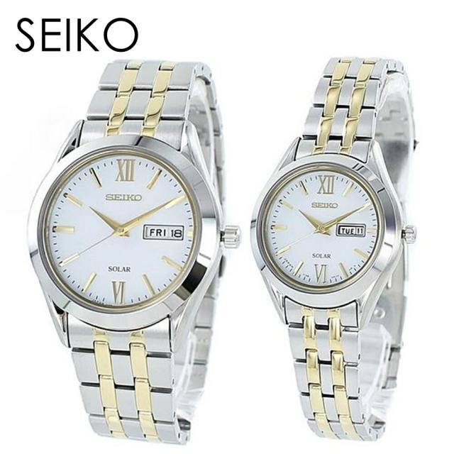 電池交換不要のソーラーウォッチ セイコー 時計 メンズ レディース ペアウォッチ デイデイト ホワイト文字盤 シルバー×ゴールド ステンレス ブレスレット SBPX085STPX033