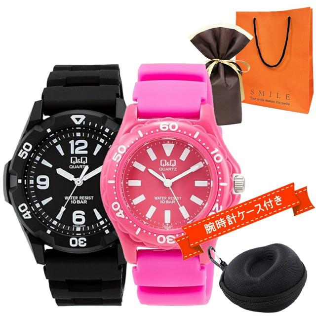 ラッピング済 ギフトセット ペアウォッチ 腕時計 Q&Q シチズン 10気圧防水 手提げ紙袋つき 時計ケース付 ペアコーデ 誕生日 お祝い プレゼント シンプル ブラック ピンク カジュアル メンズ レディース ウレタンベルト お揃い 恋人 親子 正規品