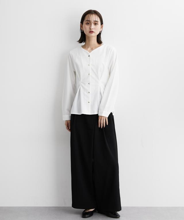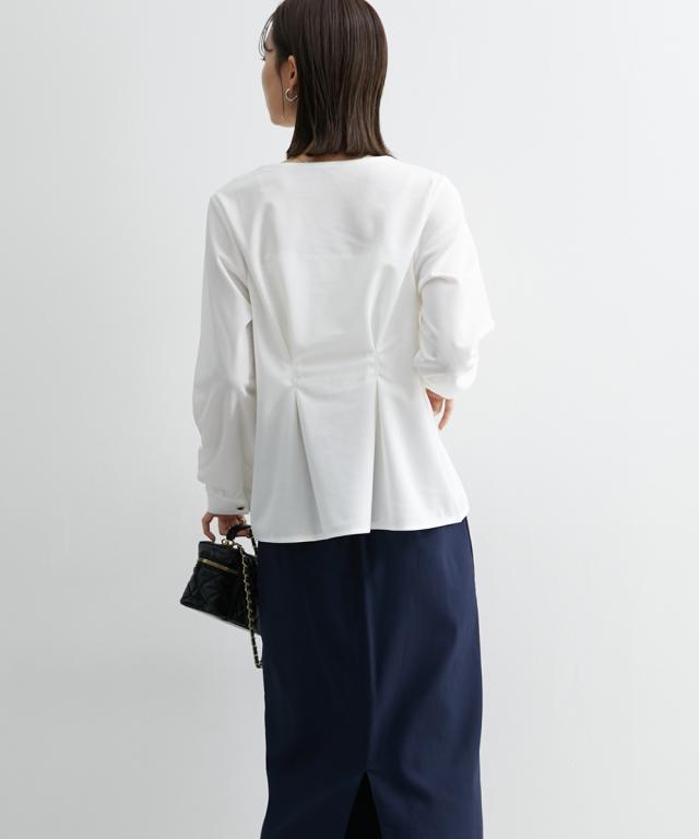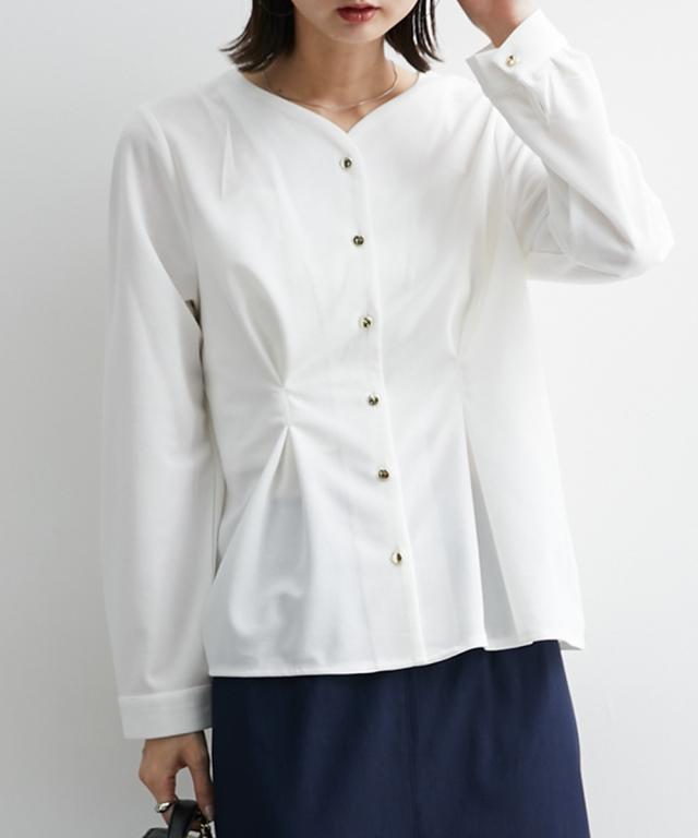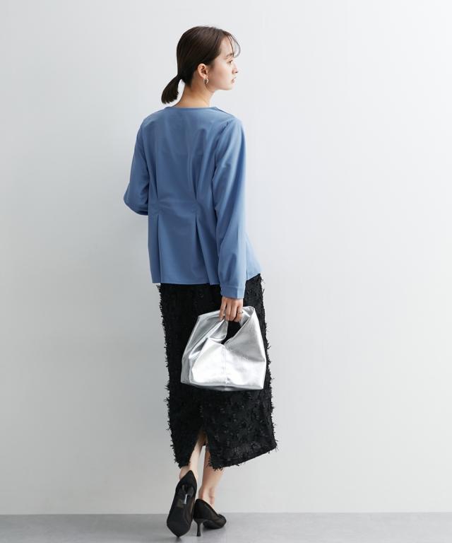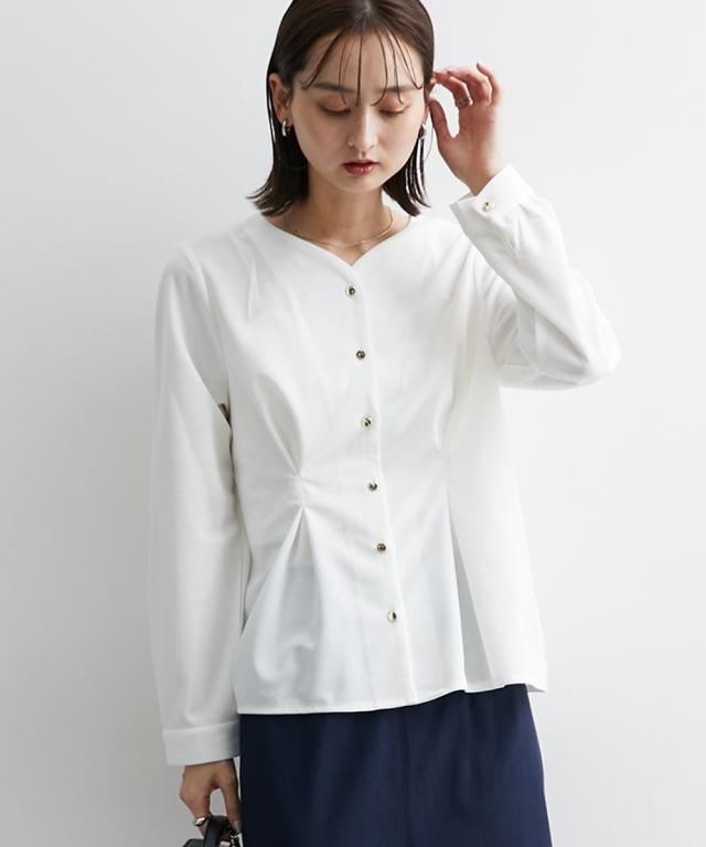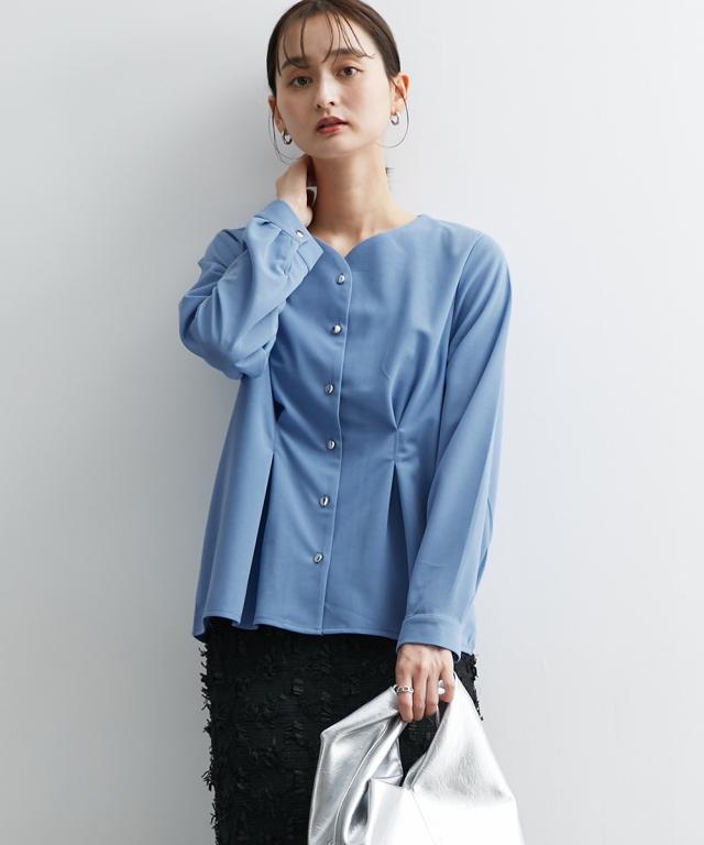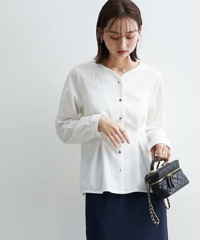 通勤スタイルにも最適 フロントタック入前開きブラウス【UVカット・洗濯機OK】 ■デザイン ウエストにデザインタックが入って、細見え効果のあるカットジョーゼットブラウス ・衿のカットは、デコルテをキレイに見せてくれるような仕様になっています。華奢見せ効果も絶大。 ・後ろ部分にも前身頃と同じタック入のデザインで後ろ姿まで美しく。 ■素材 お手入れ簡単なカットジョーゼット素材です。 ■おすすめのスタイリング トップスはインよりアウトで着用する方がかわいいので、パンツスタイルかタイトスカートでアウトでの着用がおすすめ ブラウスが少し甘めのデザインなので、タイトスカートのほうが着合わせはおすすめです。 前を開けての着用も可能ですが、前閉じのほうがスタイルアップ見せが可能なのでおすすめです。 【Be praised】ーーー明日ちょっと褒められる服ーーー 大人トレンドを意識したこだわりのアイテムと着こなしでアナタの毎日に輝きを。 ただシンプルできれいなだけじゃ物足りない。 カジュアルすぎず、スタイリッシュで大人の品性を感じる着こなしに。 そんな、こなれたオシャレを楽しむ女性に寄り添う、 新鮮なリアルクローズをご提案します。
