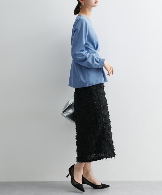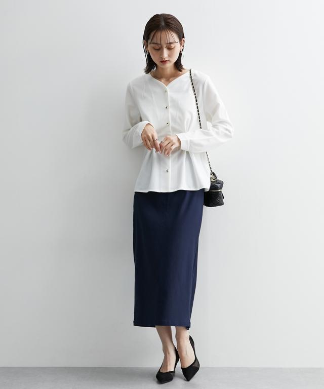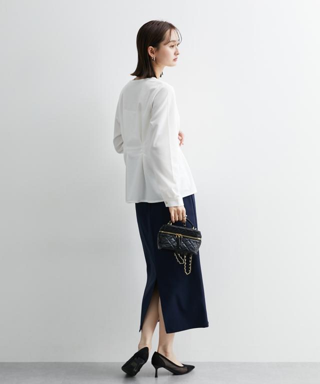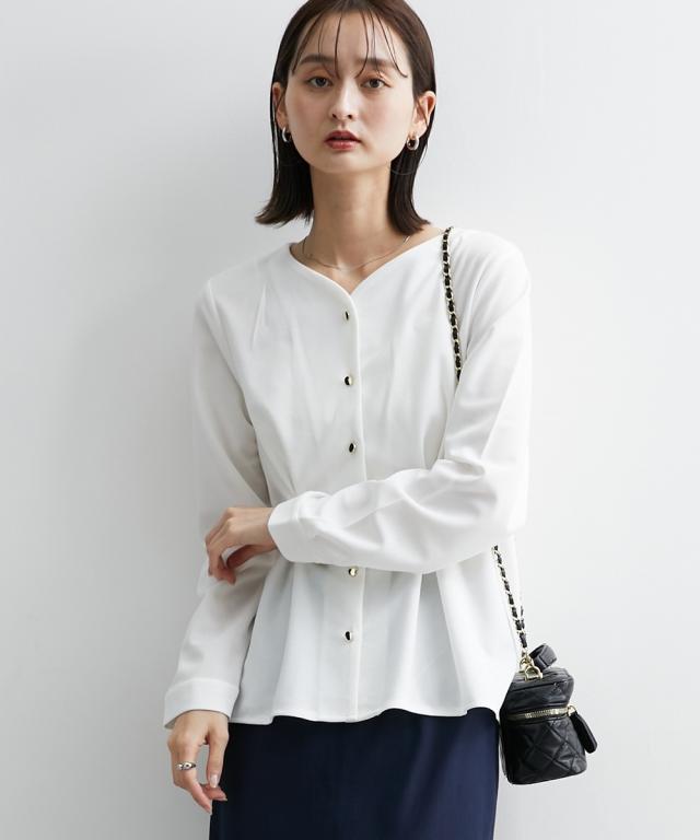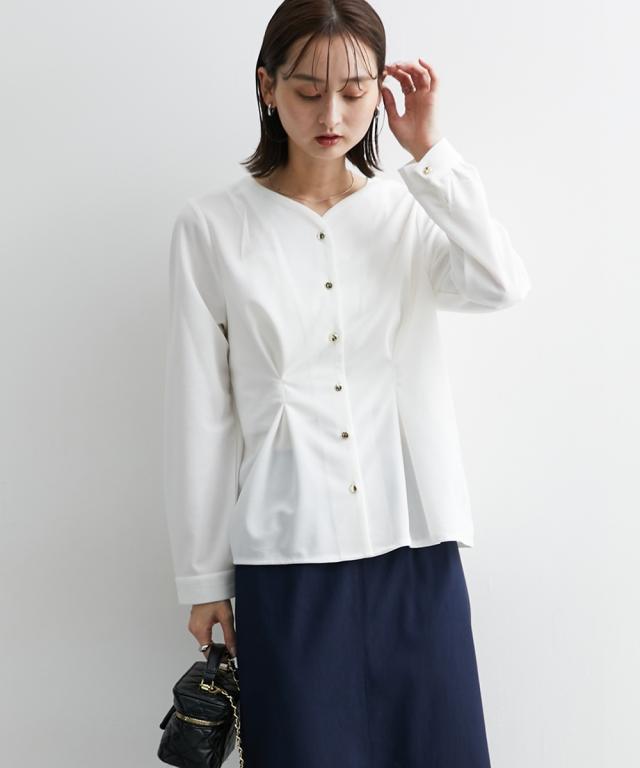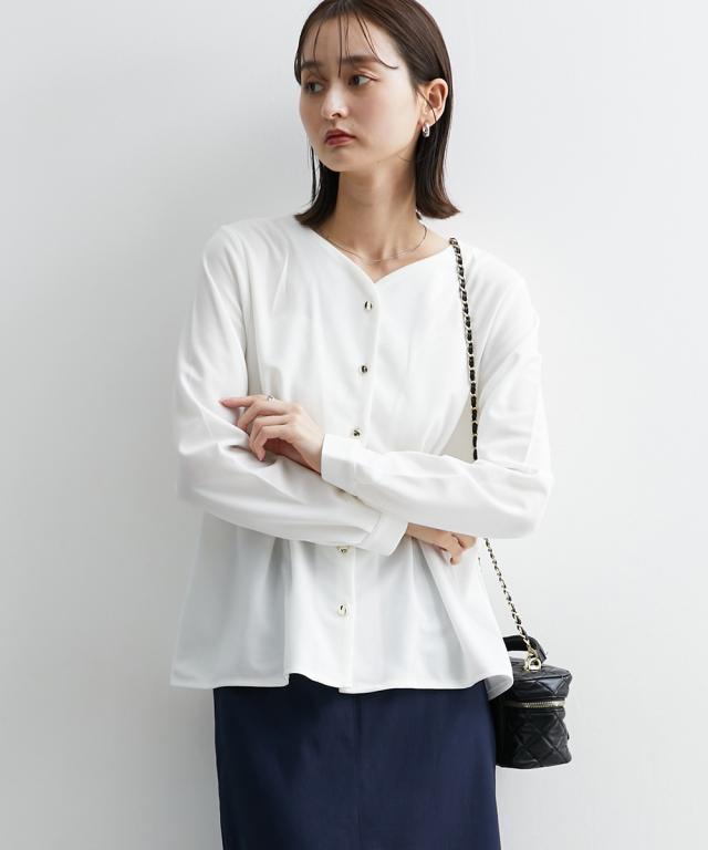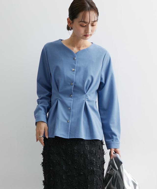 通勤スタイルにも最適 フロントタック入前開きブラウス【UVカット・洗濯機OK】 ■デザイン ウエストにデザインタックが入って、細見え効果のあるカットジョーゼットブラウス ・衿のカットは、デコルテをキレイに見せてくれるような仕様になっています。華奢見せ効果も絶大。 ・後ろ部分にも前身頃と同じタック入のデザインで後ろ姿まで美しく。 ■素材 お手入れ簡単なカットジョーゼット素材です。 ■おすすめのスタイリング トップスはインよりアウトで着用する方がかわいいので、パンツスタイルかタイトスカートでアウトでの着用がおすすめ ブラウスが少し甘めのデザインなので、タイトスカートのほうが着合わせはおすすめです。 前を開けての着用も可能ですが、前閉じのほうがスタイルアップ見せが可能なのでおすすめです。 【Be praised】ーーー明日ちょっと褒められる服ーーー 大人トレンドを意識したこだわりのアイテムと着こなしでアナタの毎日に輝きを。 ただシンプルできれいなだけじゃ物足りない。 カジュアルすぎず、スタイリッシュで大人の品性を感じる着こなしに。 そんな、こなれたオシャレを楽しむ女性に寄り添う、 新鮮なリアルクローズをご提案します。