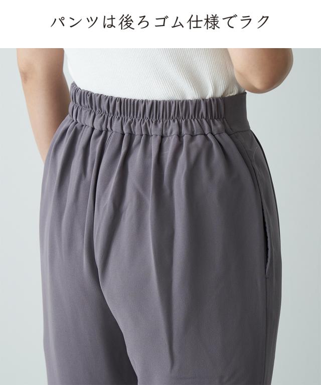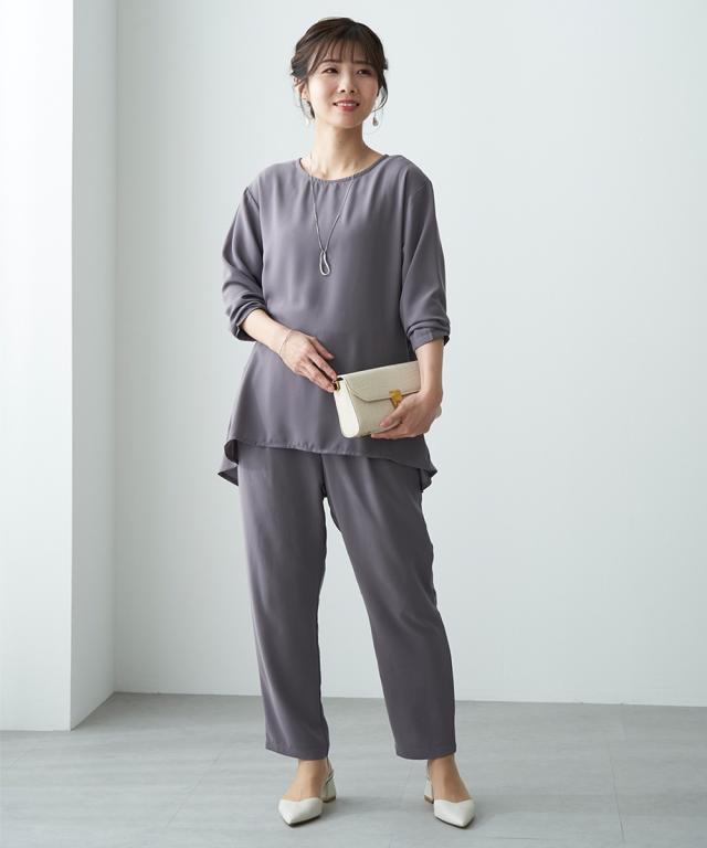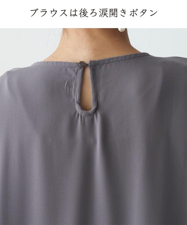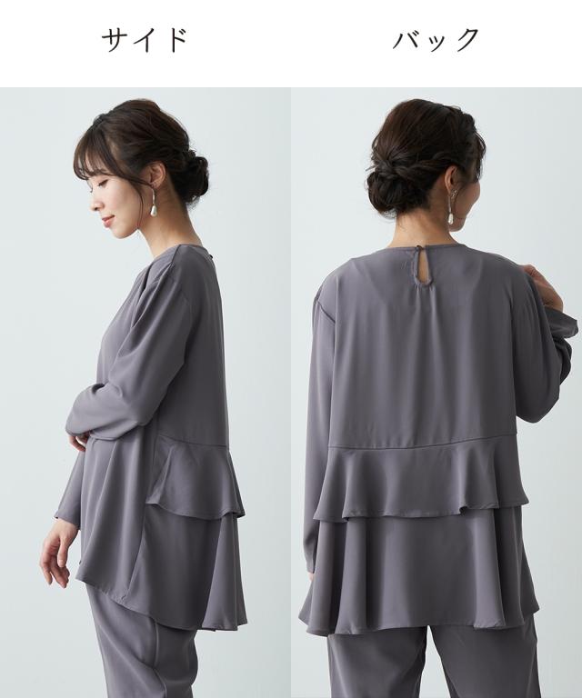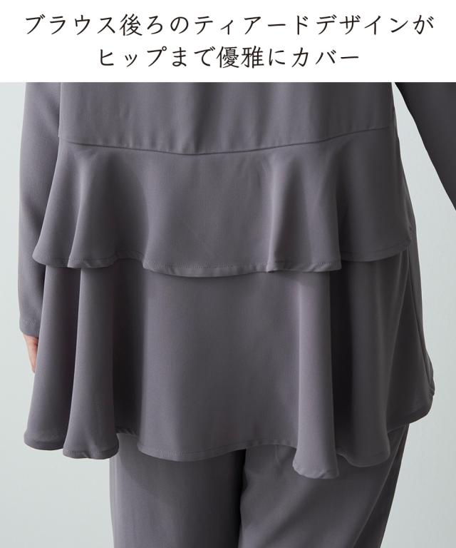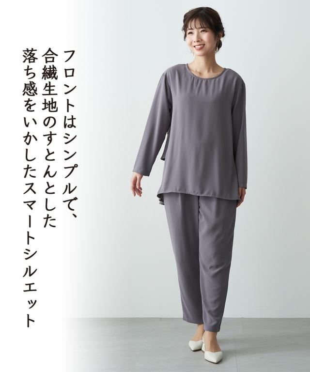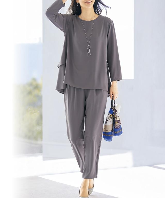 後ろ姿も華やぐセットアップ。 ブラウス:後ろのティアードデザインがヒップ下まで優雅にカバー。前はシンプルなスマートシルエット。 パンツは合繊素材のすとんとした落ち感をいかしたテーパードシルエット。 40代、50代、60代、母娘でも共有できて幅広い年代の方におすすめできるデザインです。 お誕生日プレゼントなどの贈り物としてもおすすめです。