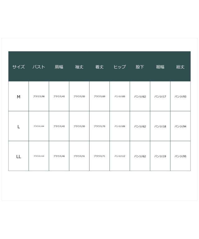 品質=ポリエステル100% 裏地(パンツのみ):ポリエステル100%【ブラウス】後ボタン 【パンツ】ウエスト後ゴム仕様 左右ポケット付 ※この商品は上下同サイズのみで販売します。 原産国:中国製 洗濯表示:手洗い