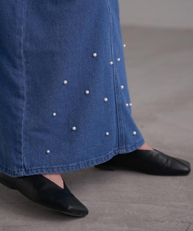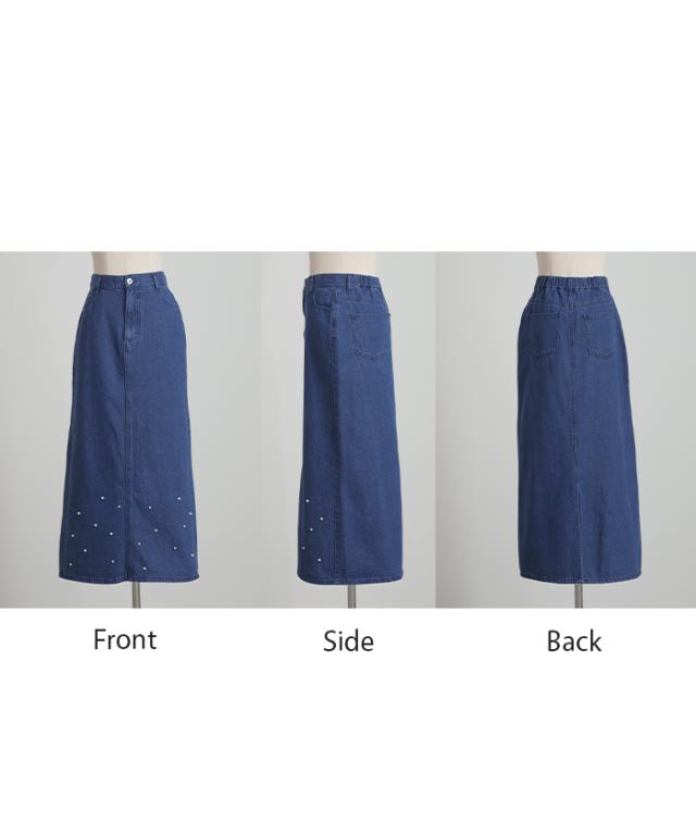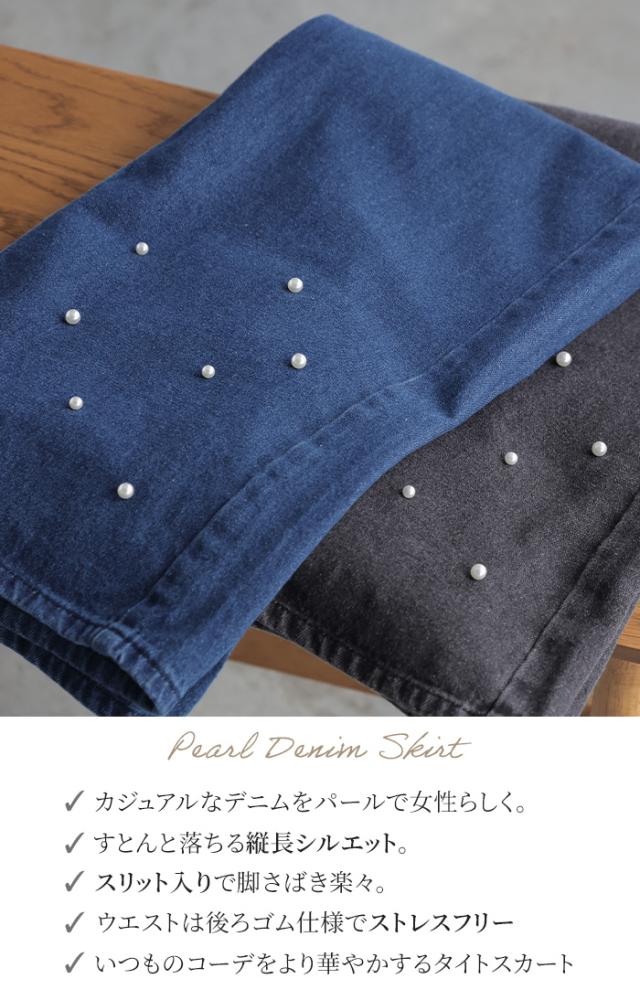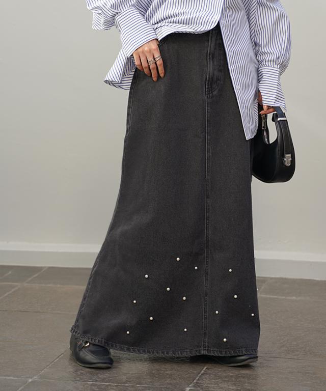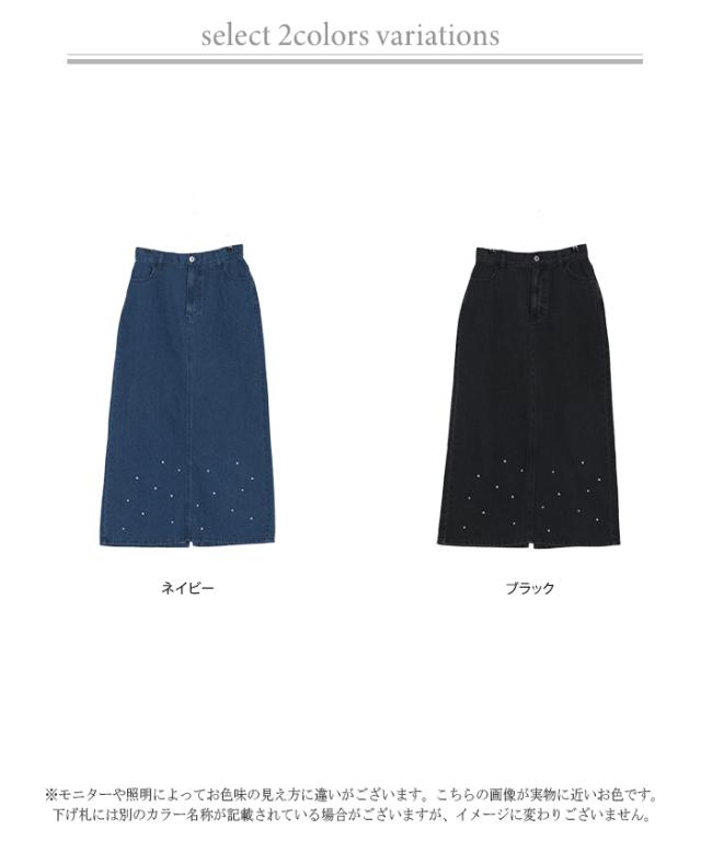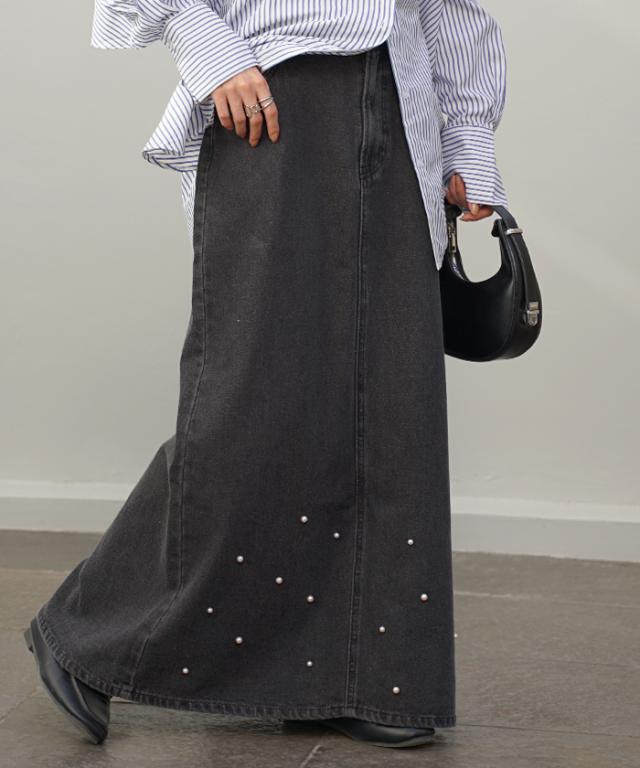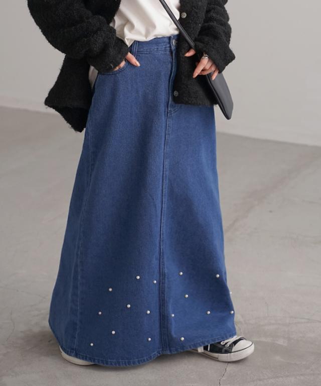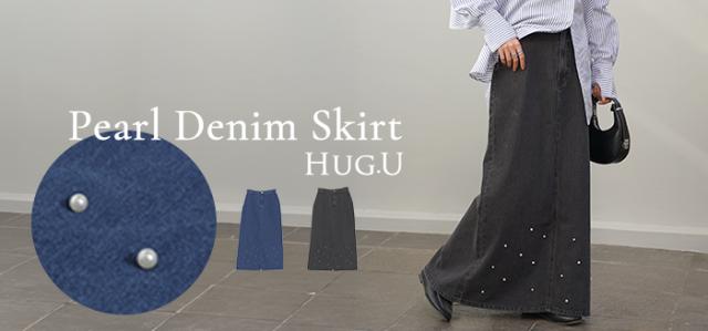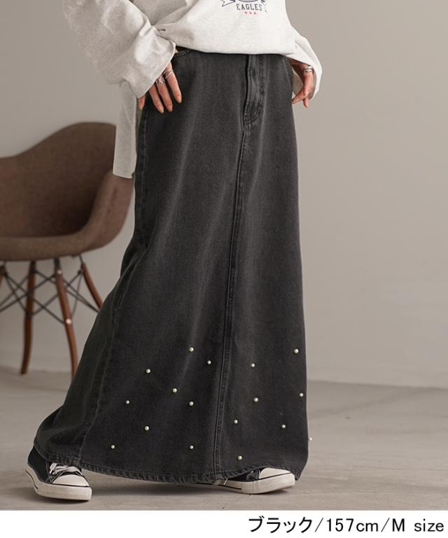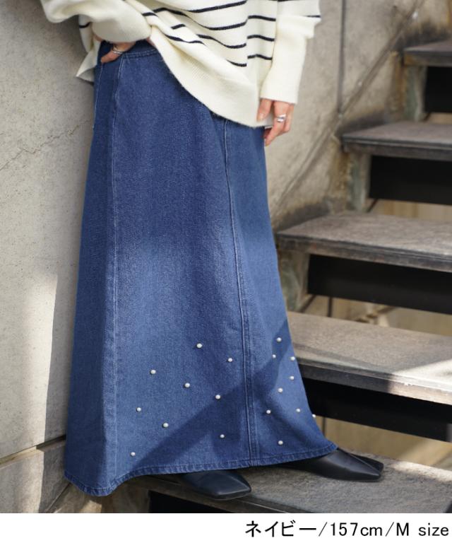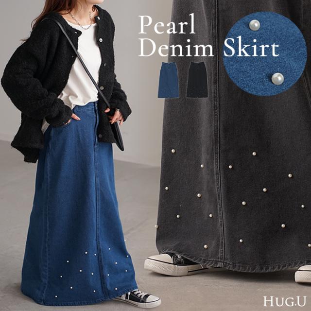 スカート デニム パール ロング レディース ボトムス デニムスカート ウエストゴム Aライン フレア 綿100% コットン100% マキシ マキシスカート 無地 大きいサイズ 体型カバー ハイウエスト タイト ボトム きれいめ カジュアル ネイビー 黒 春 夏 HUG.U