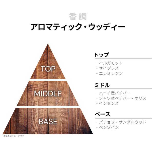 ベルガモット、サイプレス、エレミ・レジンなどが、オーガニックでオープンなトーンのウッディー・フレッシュを香り立たせるトップから、
