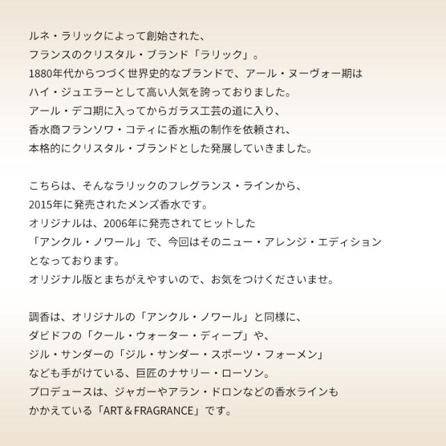 こちらは、そんなラリックのフレグランス・ラインから、2015年に発売されたメンズ香水です。オリジナルは、2006年に発売されてヒットした「アンクル・ノワール」で、今回はそのニュー・アレンジ・エディションとなっておりあす。オリジナル版とまちがえやすいので、お気をつけくださいませ。