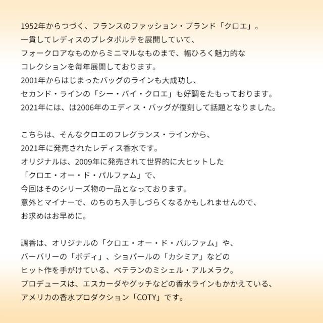 オリジナルは、2009年に発売されて世界的に大ヒットした「クロエ・オー・ド・パルファム」で、今回はそのシリーズ物の一品となっております。意外とマイナーで、のちのち入手しづらくなるかもしれませんので、お求めはお早めに。