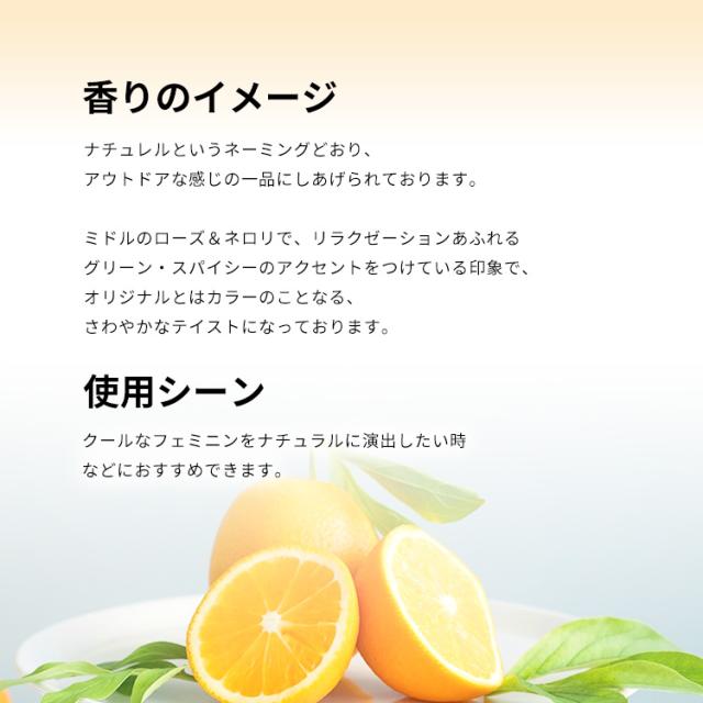 香りは、シトラス・フローラル・ウッディーのさわやかな香調がベース。ナチュレルというネーミングどおり、アウトドアな感じの一品にしあげられております。