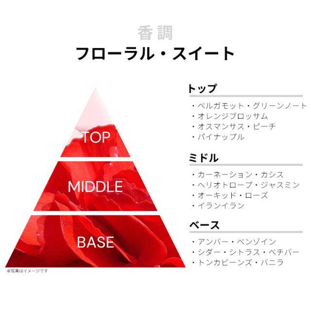 トップはベルガモット、グリーンノート、オレンジブロッサム、オスマンサス、ピーチ、パイナップルなど。ミドルはカーネーション、カシス、ヘリオトロープ、ジャスミン、オーキッド、ローズ、イランイランなど。ラストはアンバー、ベンゾイン、シダー、シトラス、トンカビーンズ、バニラ、ベチバーなど。とろけるような甘さが魅惑的。
