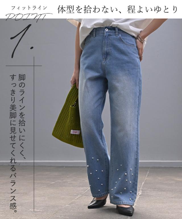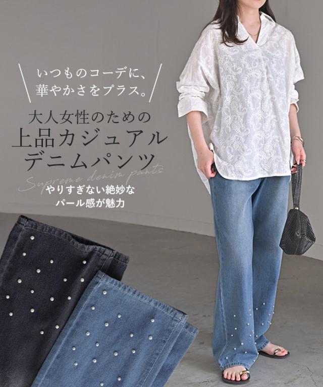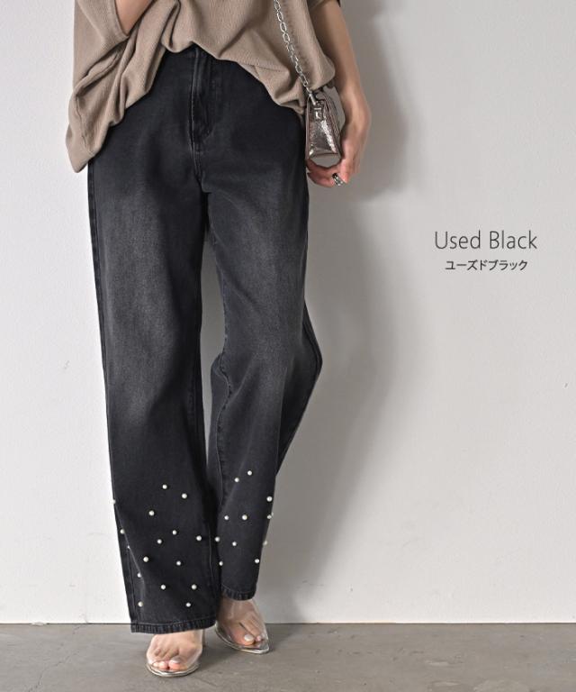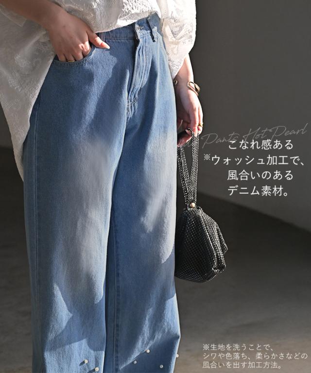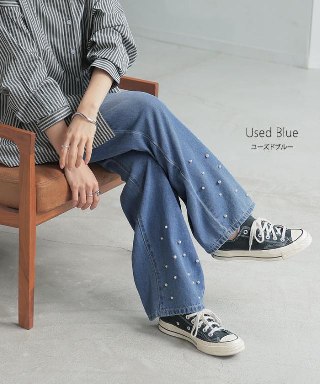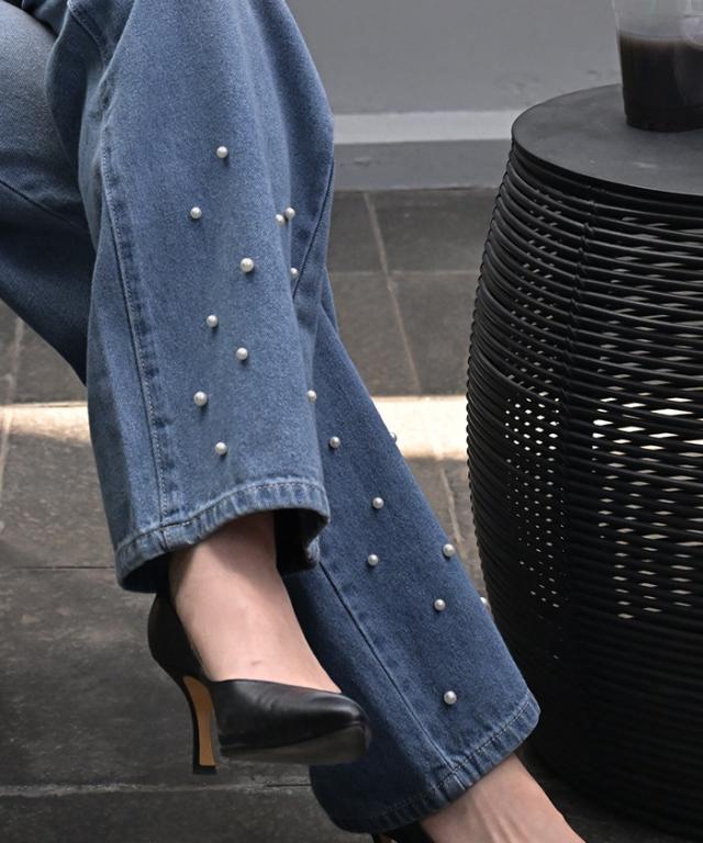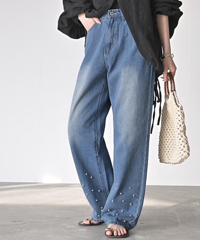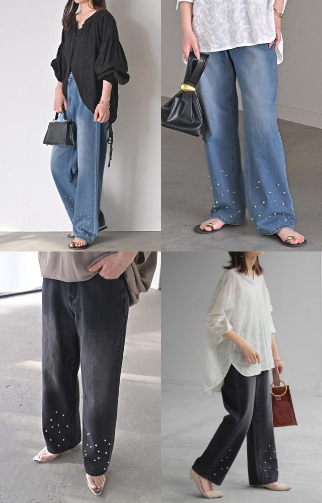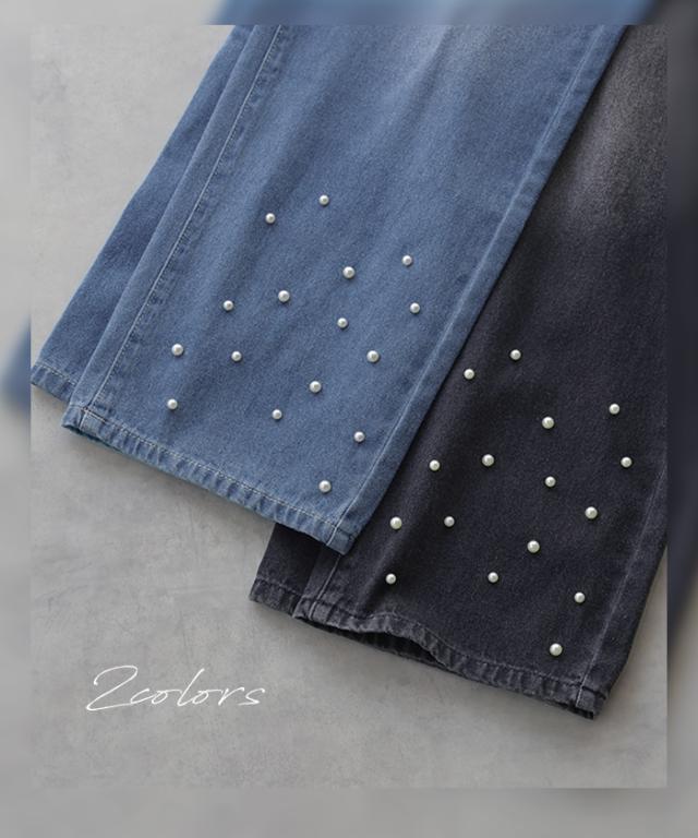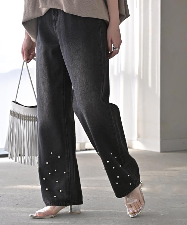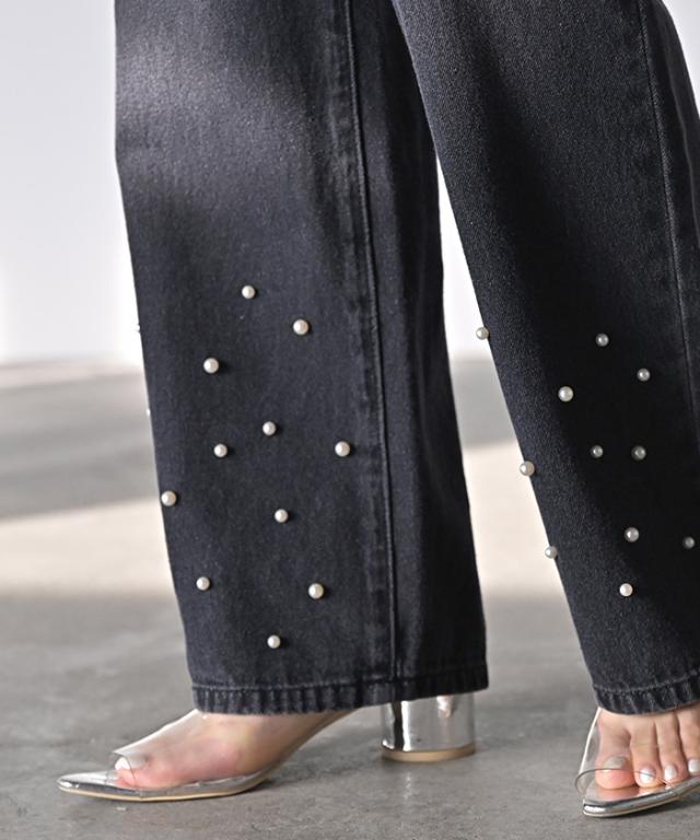 散りばめられたパールが目を惹くデニムパンツです。