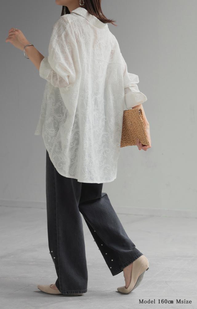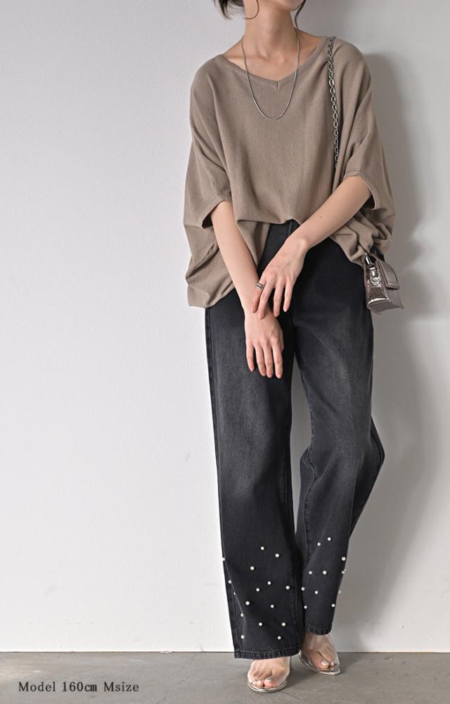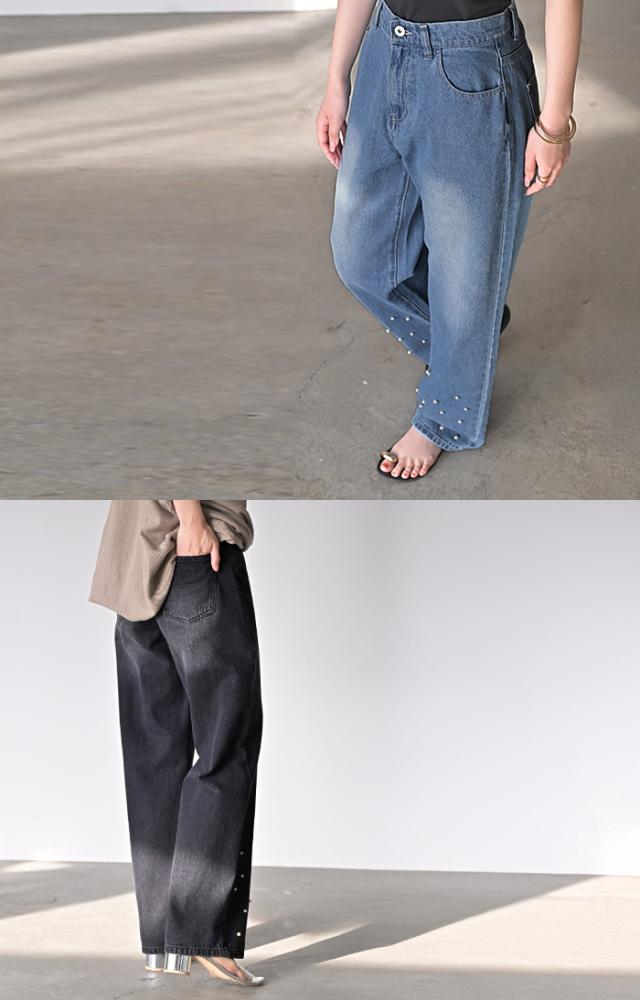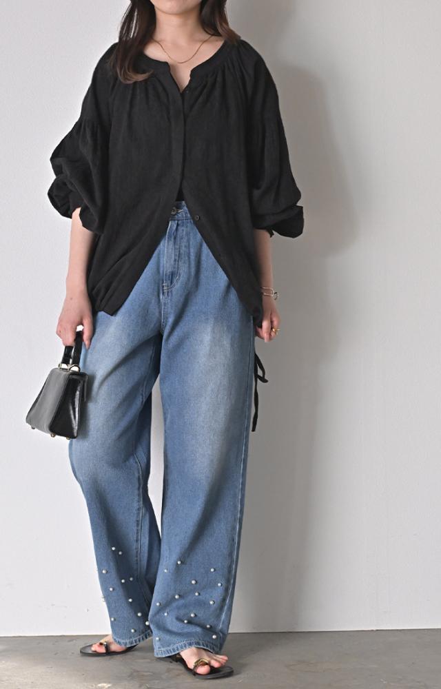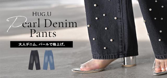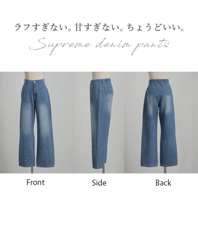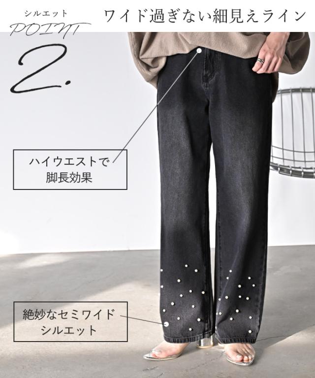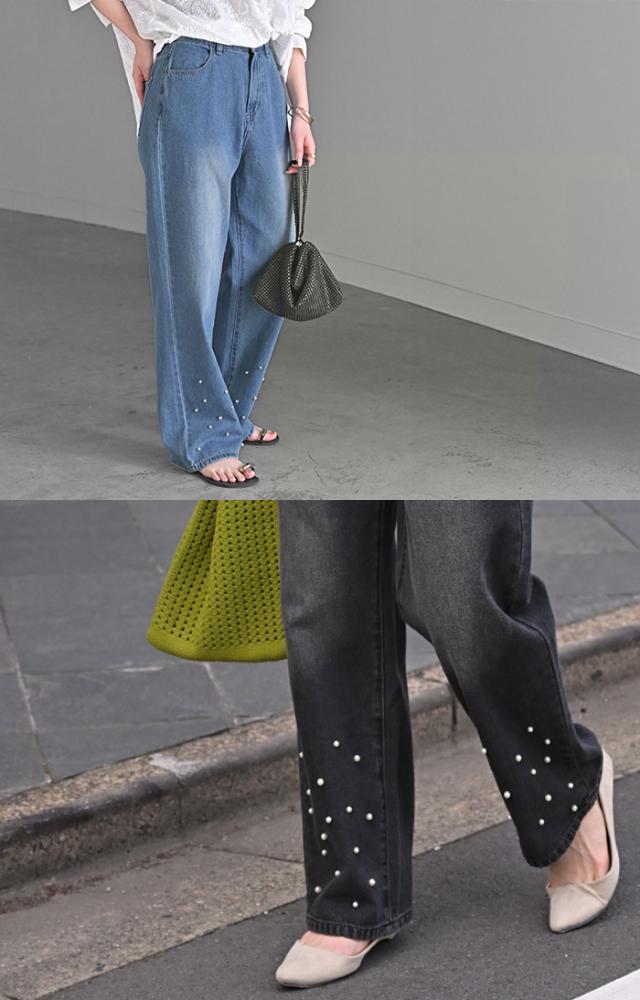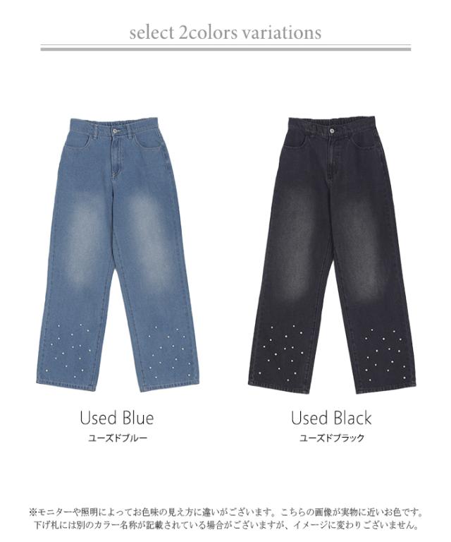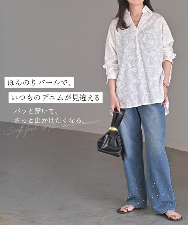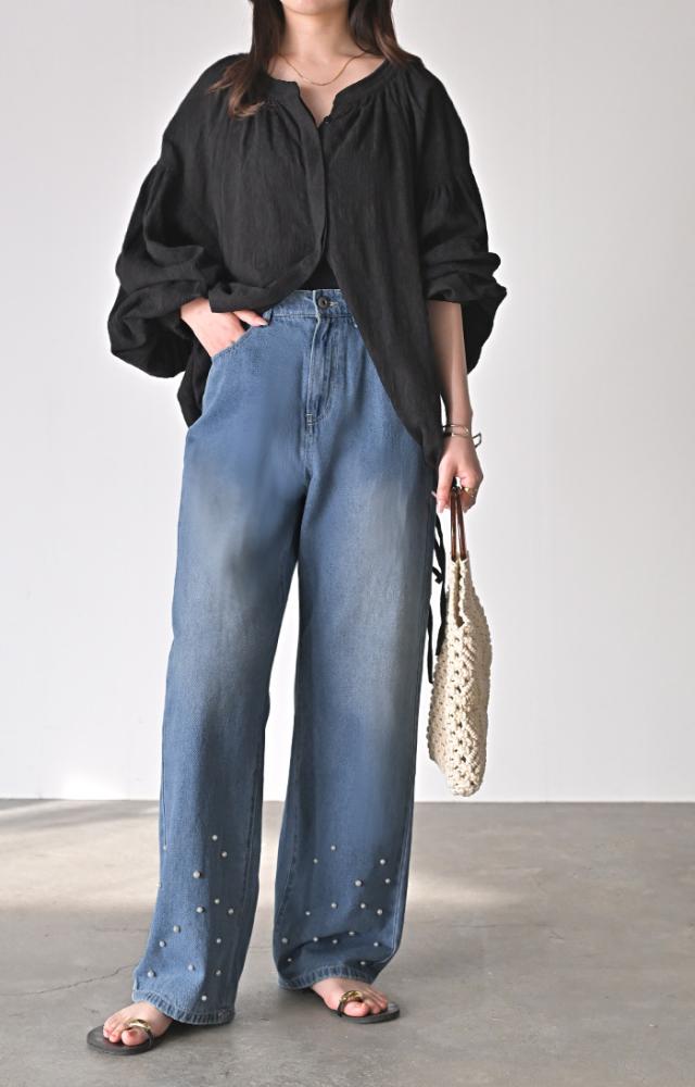 散りばめられたパールが目を惹くデニムパンツです。