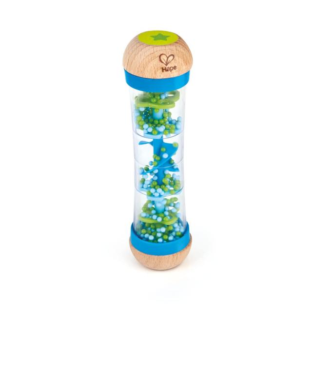 ひっくり返すと、こぼれ落ちるビーズと心地良い雨音が、感覚を刺激します。握りやすい形なので振って音を楽しむのに最適。感覚を発達させるのに最適。