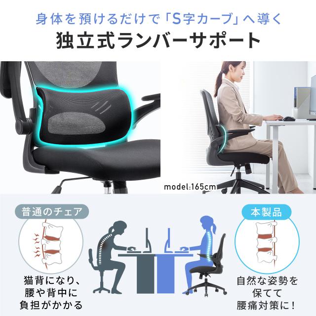 ⇒ご購入の前にご確認下さい背もたれ分離式で腰の部分がせり出ているメッシュチェア。背もたれの形状は人間工学に基づいたS字カーブ。腰の負担を軽減するセパレート型ランバーサポートを装備。背もたれには涼しいメッシュ素材を使用し、蒸れにくく快適。座面のクッション性が高いウレタンクッションを採用。背座一体型のロッキング機能搭載。跳ね上げ式肘アームレスト仕様。【WEB限定商品】