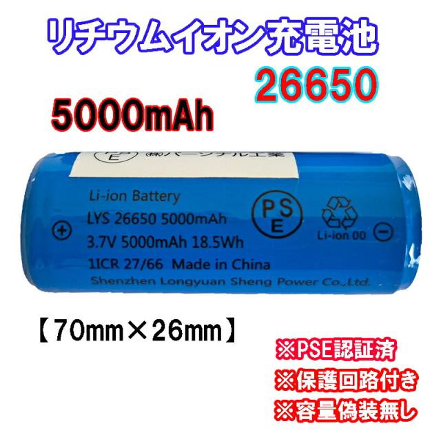 商品詳細: 容量偽装なし!5000mAh大容量の26650リチウムイオン電池です!高品質で保護回路付きで安全に使用できます。製造工場はPSE届出済みです。