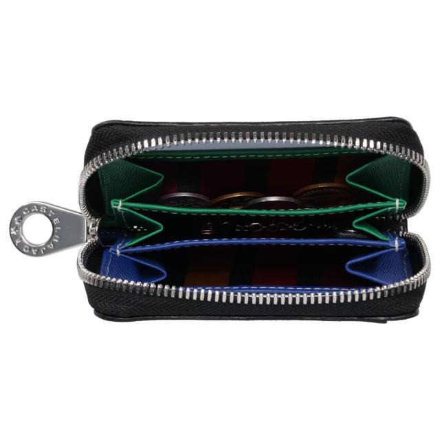 艶感による陰影が魅力的なエンボスレザーを使用したカステルバジャックのベーシックな小銭入れ。ブランドカラーを用いたギャップ感のある内装やレインボーカラーの裏地がカステルバジャックらしさを演出しています。外装は陰影のある角シボエンボスレザーをメイン素材に、艶感のあるガラスレザーを使用したレザーワッペン、加えて手作業のかがりステッチでブランドカラーを表現し、落ち着いたベーシックなデザインです。