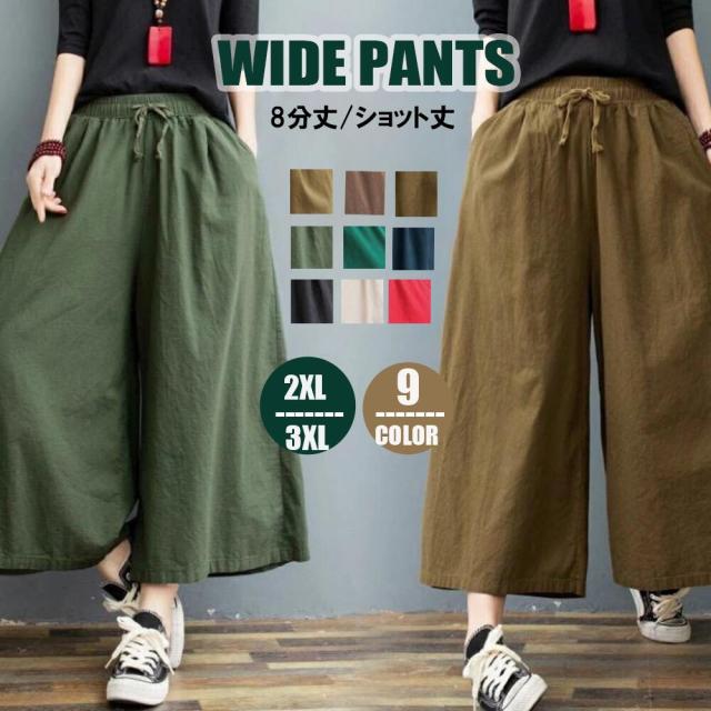 ガウチョパンツ ワイドパンツ レディース 大きいサイズ レディースパンツ 春夏 秋冬 スカーチョ スカンツ ウエストゴム 9分丈 綿 コットン ハイウエスト ボトムス おしゃれ 可愛い ゆったり ナチュラル 無地 体型カバー 黒 赤 ブラウン ベージュ