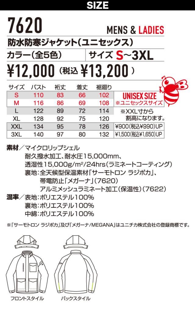 2024年秋冬新作 バートル BURTLE 7620 大きいサイズ BIG XXL-3XL 秋冬用 防水防寒ジャケット 防寒着 透湿 撥水 耐水 制電ケア 防寒ジャンパー 企業 法人 作業 工場 外作業 ワークユニフォーム 土木 工事 現場 メンズ ユニセックス BURTLE 作業服 作業着