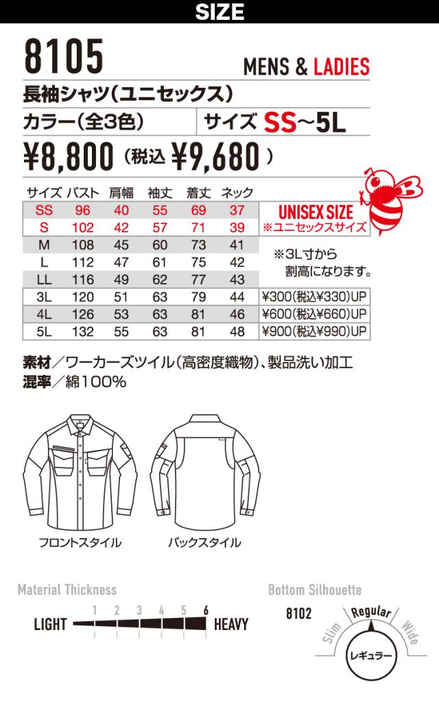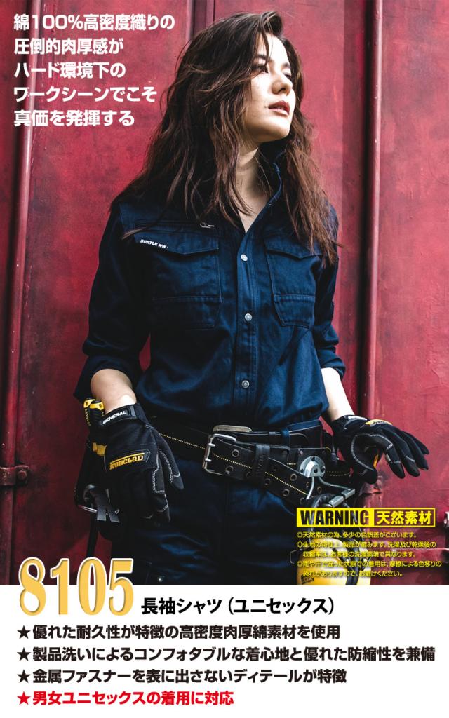 バートル BURTLE 長袖シャツ 8105 大きいサイズ BIG 5L 作業着 綿100% 防縮 縮みにくい 通年 秋冬 上着 おしゃれ かっこいい 人気 企業 法人 作業 工場 外作業 ワークユニフォーム 土木 工事 現場 メンズ ユニセックス BURTLE 作業服 作業着