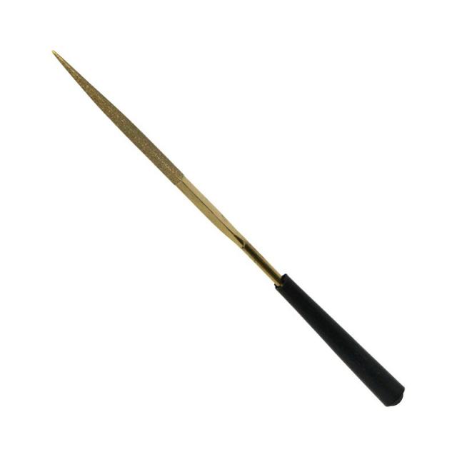 | 機能 | 精密ダイヤモンドヤスリの三角型です。ダイヤモンドパウダーを基材に電着させているので、目詰まりしにくくなっています。チタンコーティングを施し、表面のダイヤモンド粒子の保持力をアップさせています。研削方向がなく押しても引いても削れ、ダイヤモンド粒子によって研削力が高くなっているので、軽く押し当てるだけで削れます。基材にはメッキを施し、防錆処理を施しています。 |
