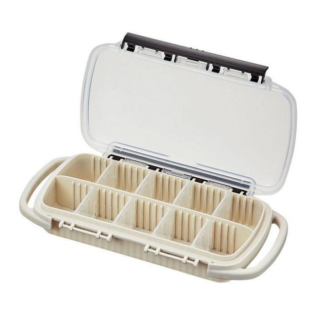 | 仕様 | ●外寸:(L)214×(W)105×(H)35mm。●内寸:(L)165×(W)72×(H)28mm。●重量:0.13kg。●カラー:クリア/オフホワイト。●仕切板8枚付。●カラビナサイズ(約):幅31×長さ61×厚み4mm。●フック部引張強度:20kgf。 |