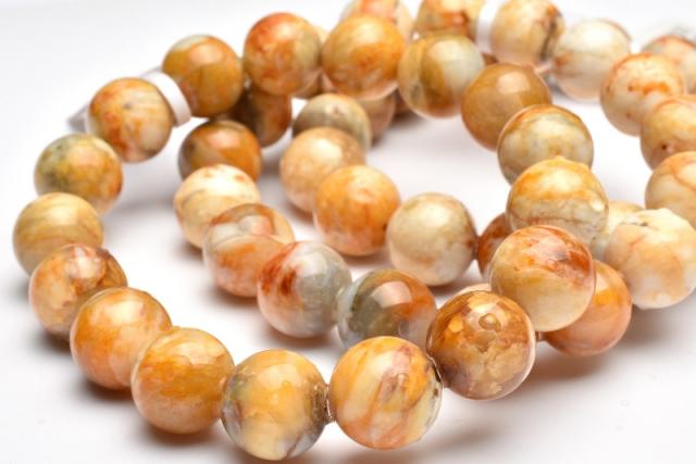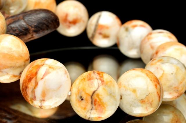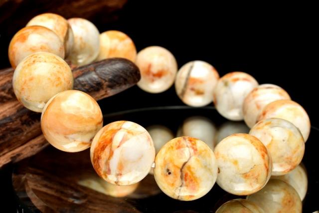 | 特徴・意味 | 肌なじみの良い天然色と芸術的な模様が目を惹くブレスレットです。 強い光に当てると美しいキャッツアイが浮かび上がる珠もあり幻想的です。 遊色効果のあるオパールを「プレシャスオパール」と言い、遊色効果のないオパールを「コモンオパール」と言います。 コモンオパールの中には、「イエローオパール」「ピンクオパール」などがあります。 こちらは酸化鉄の影響で黄色味を帯びた「イエローオパール」に当たります。 「イエローオパール」は別名「バナナオパール」と呼ばれます。 ※遊色効果とは? 珪酸球の並びが規則的なものは、見る角度によって変化しながら虹のように輝きます。 このことを「遊色効果」と言います。 |