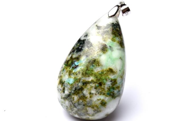 | 特徴・意味 | 抹茶のようなカラーが可愛らしいペンダントトップです。 透明度の高い水晶に、グリーンのエピドート(緑簾石)が入った美しい石です。 日本では《草入り水晶》と呼ばれています。 エピドートは、日本名を緑廉石と呼ばれ、このグループにはゾイサイト(灰簾石)やピーモンタイト(紅簾石)、クリノゾイサイト(斜灰簾石)など10種類以上の鉱物が属しています。 色は、黄色〜緑、または濃褐色などをしており、強い多色性を表します。 鉄分が多ければ多いほどより濃い緑色になります。 この独特な緑色は、漆科の植物のピスタチオの実の色に似ていることから、ピスタサイトとも呼ばれています。 多くの産地で産出はされていますが、美しい結晶体での産出は比較的少なく、透明感を持つ結晶は希な部類となります。 また、他の鉱物と共生した状態で多く産出されており、内包物としてもよく知られる鉱物となっています。 こちらは水晶に内包されたタイプになります。 |