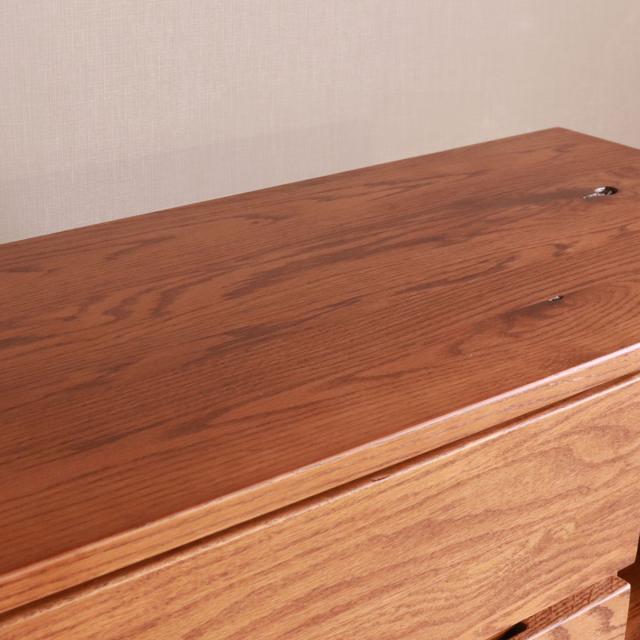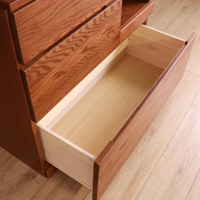 前板にはハッキリと木目が出るのが特徴のレッドオーク無垢材を使用しています。ほのかに赤みがかった木肌が美しく、天然木ならではの木目や模様をお楽しみいただけます。