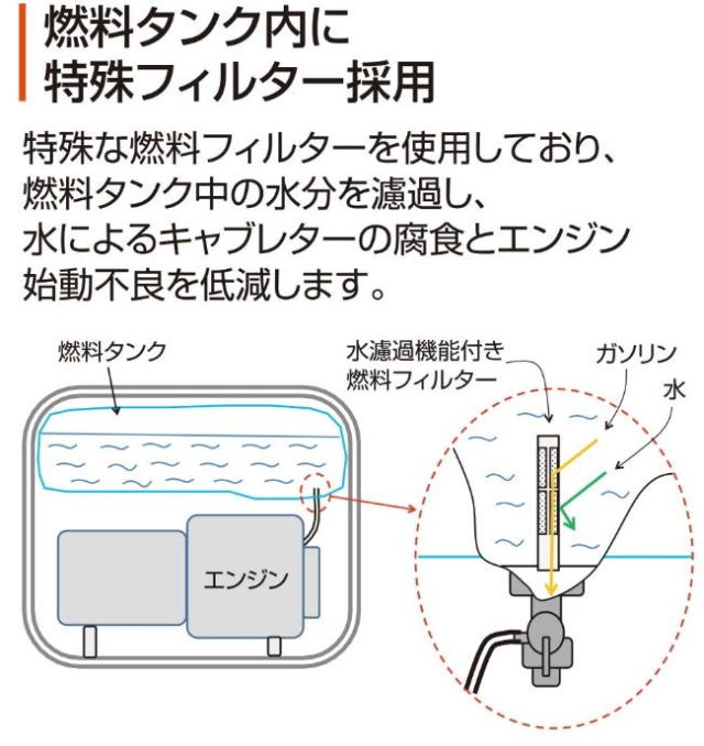 | ・始動不良を低減する特殊燃料フィルター採用。 ・キャブレター詰まりを防止する錆吸着機能付。 ・初めての方でも操作簡単! 操作手順ラベル付。 ・国土交通省 超低騒音型建設機 超低騒音(69.1〜66.5 dB(A)) だから場所を選ばず使えます。 |