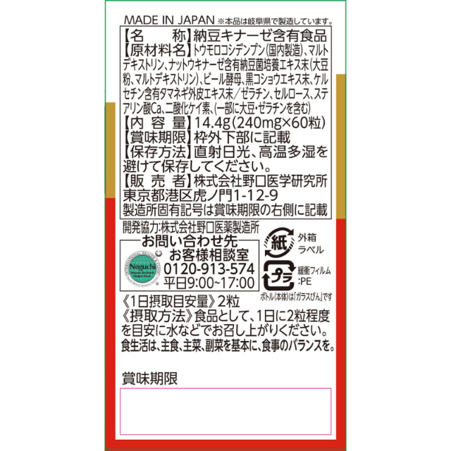 商品名 野口医学研究所 納豆キナーゼ 2000FU 60粒 30日分 栄養補助食品 容量 60粒 原材料名 トウモロコシデンプン(国内製造)、マルトデキストリン 、ナットウキナーゼ含有納豆菌培養エキス末(大豆粉、マルトデキストリン)、ビール酵母、黒コショウエキス末、ケルセチン含有タマネギ外皮エキス末/ゼラチン、セルロース、ステアリン酸Ca、二酸化ケイ素、(一部に大豆・ゼラチンを含む) アレルギー特定原材料 ー 加工地 日本 賞味期限 商品の発送時点で、360日以上あるものをお届けいたします 保存方法 常温 区分 栄養補助食品 1日摂取目安量 2粒 摂取方法 食品として1日に2粒程度を目安に水などでお召し上がりください。 その他 食生活は主食、主菜、副菜を基本に、食事のバランスを。