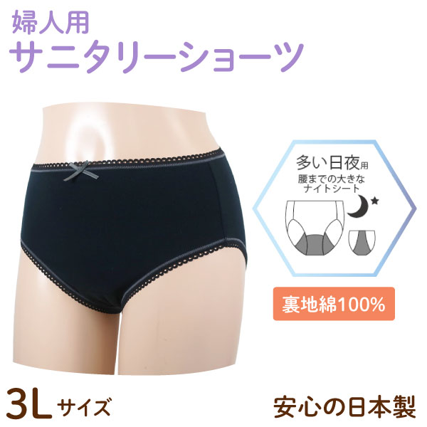 日本製 サニタリーショーツ 婦人用 肌に触れる内側 綿100% 多い日夜用 生理用 【メール便送料無料】吸水 ナプキン ブラック 3Lサイズ