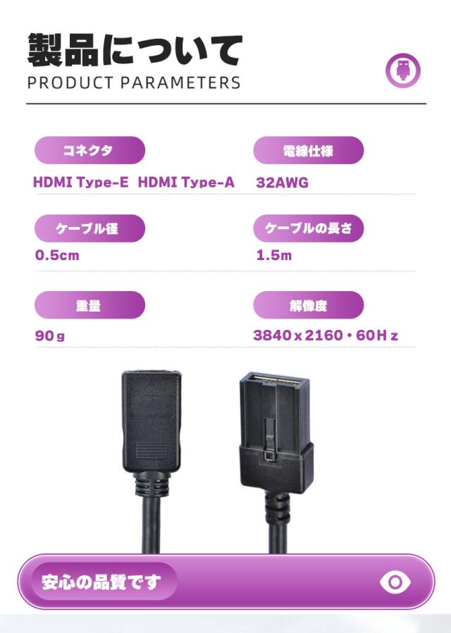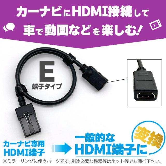 カーナビに接続してHDMI出力機器を楽しめる変換ケーブルカーナビ用TYPE-Eを一般的なTYPE-Aに変換【ほとんどのナビに対応】・一般的なほとんどのナビに対応しています。・差し込むだけの簡単接続。・高品質で耐久性に優れています。・1.5mと扱いやすいケーブル長。・車でお持ちの機器をみんなで楽しめます♪