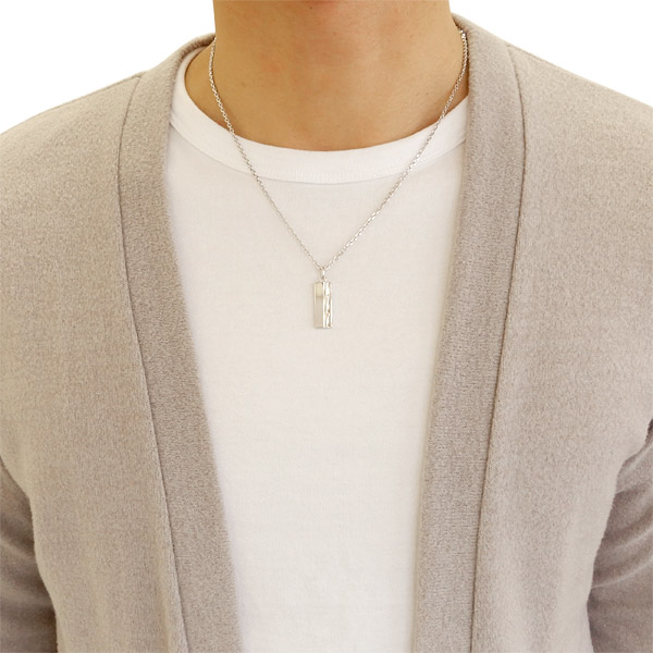 アクセントに“糸縒り”をイメージしたツイストバーを配置し、全体にロジウムメッキを施すことで独特な光の反射を放つプレートネックレス。