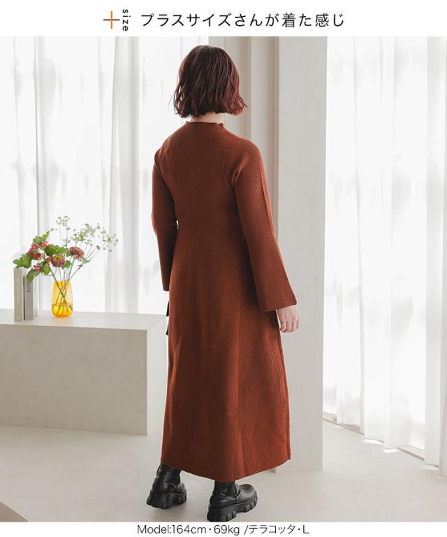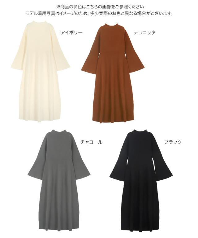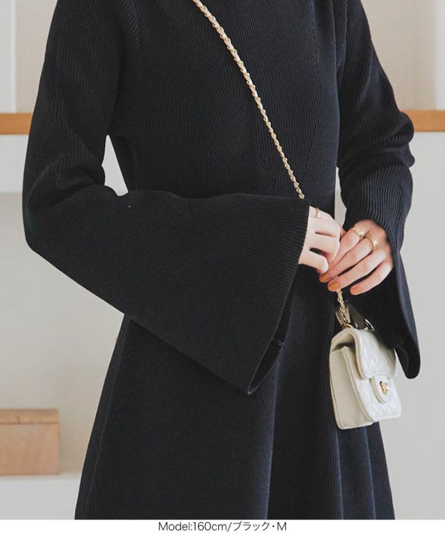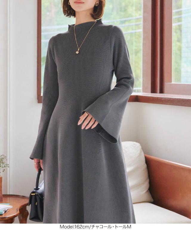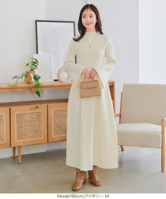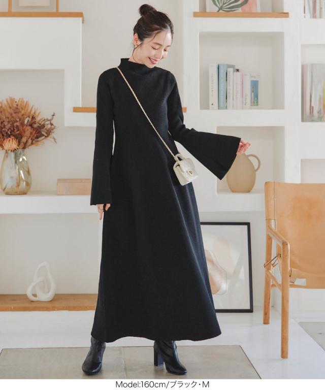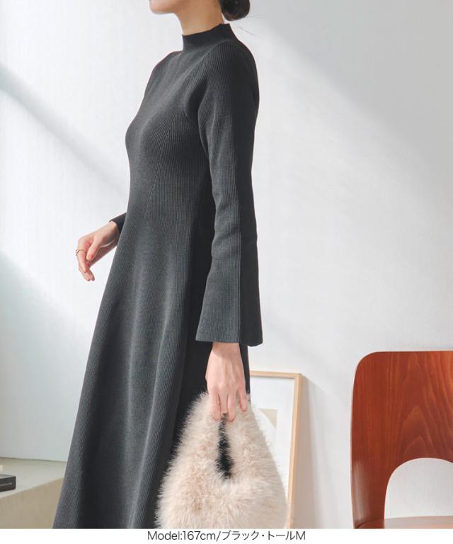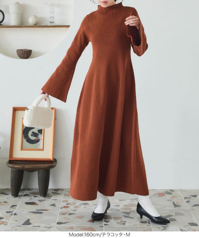 フレアスリーブニットワンピース E3400 入荷済 レディース ワンピ ロング丈 秋 冬 20代 30代 40代 リブ ロング ワンピース ニット ボトルネック ハイネック フレアスリーブ フレア ベルスリーブ ボリューム袖 体型カバー 低身長