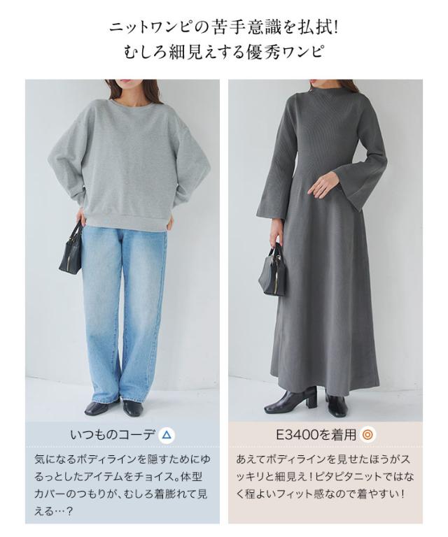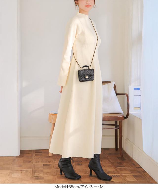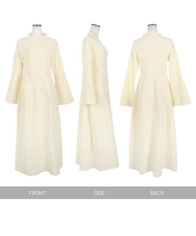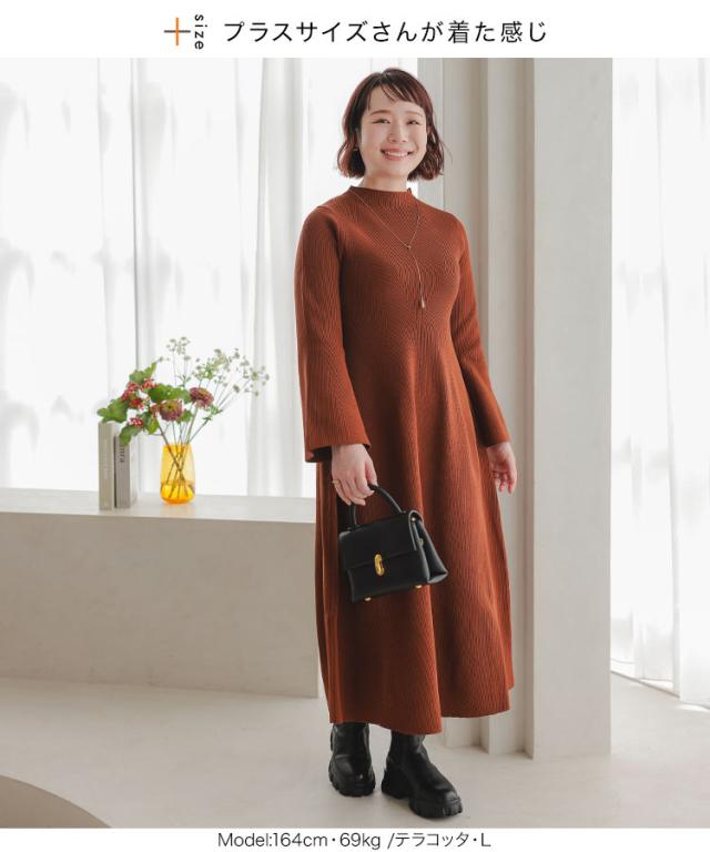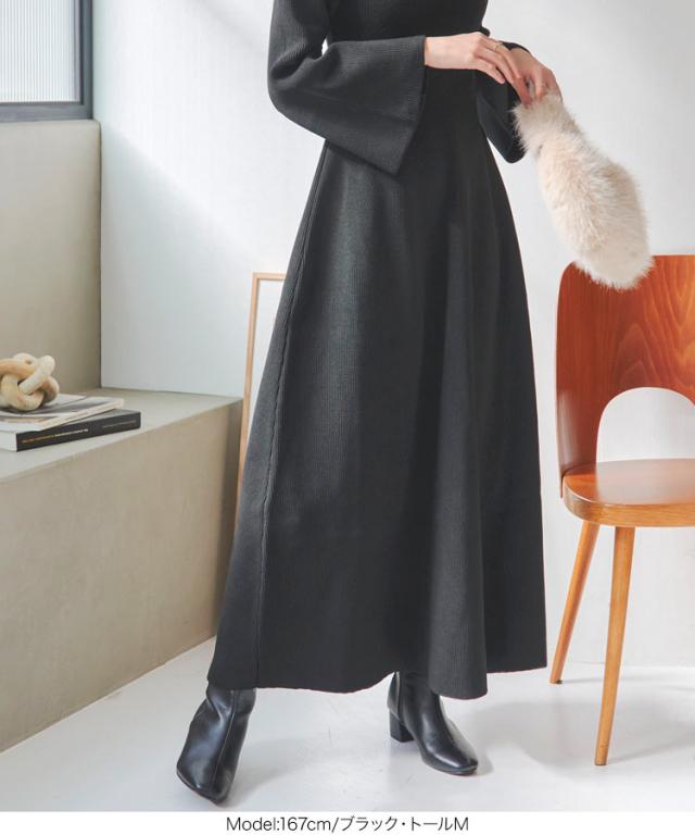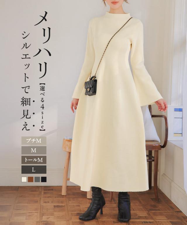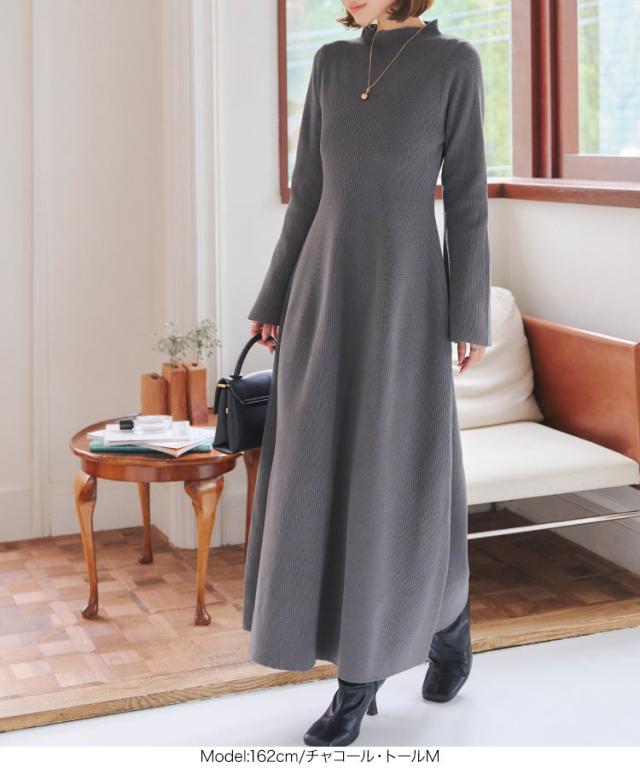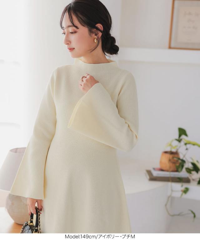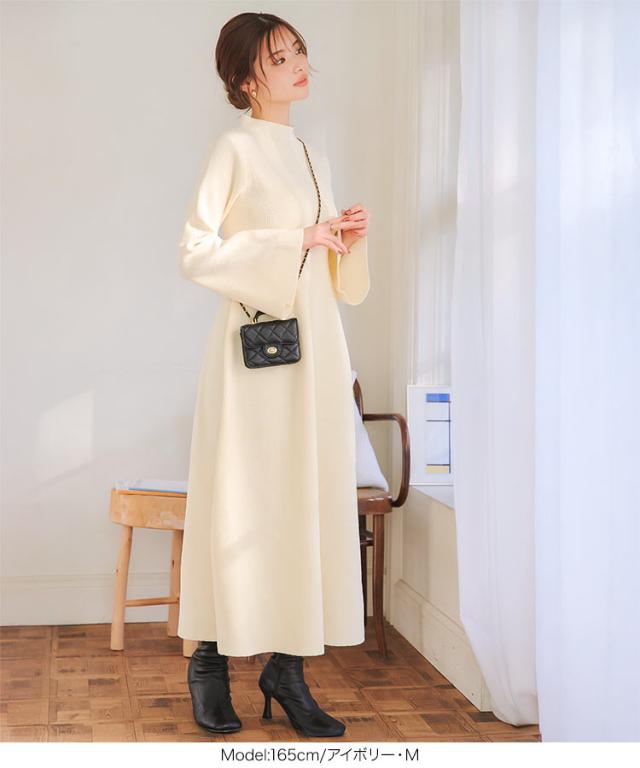フレアスリーブニットワンピース E3400 入荷済 レディース ワンピ ロング丈 秋 冬 20代 30代 40代 リブ ロング ワンピース ニット ボトルネック ハイネック フレアスリーブ フレア ベルスリーブ ボリューム袖 体型カバー 低身長